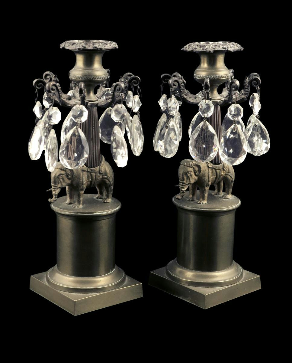 A pair of Regency gilt and patinated bronze candlesticks, each with a moulded detachable nozzle, to eight scroll arms hung with glass drops to a reeded stem and an elephant base, to a turned column and square plinth, 25.2cm high, 10.5cm wide. (2)