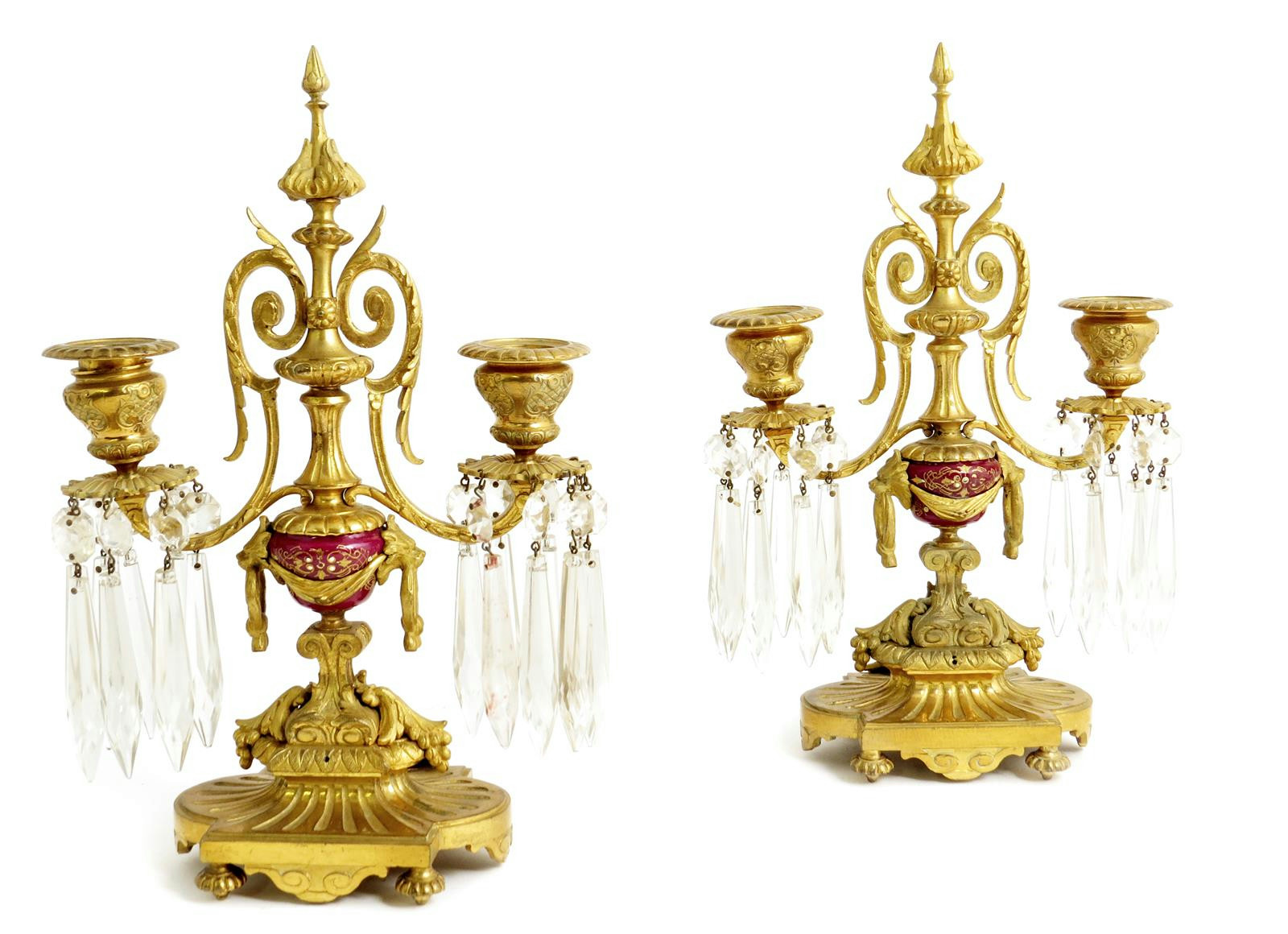 A pair of 19th century ormolu and porcelain candelabra, with scroll arms to twin lights, with detachable sconces, stamped '71', hung with cut glass dops and lustres, to puce and jewelled porcelain urn bodies with lion's mask drapes, the bases stamped 'G41', 29.5cm high, 19.5cm wide. (2)
