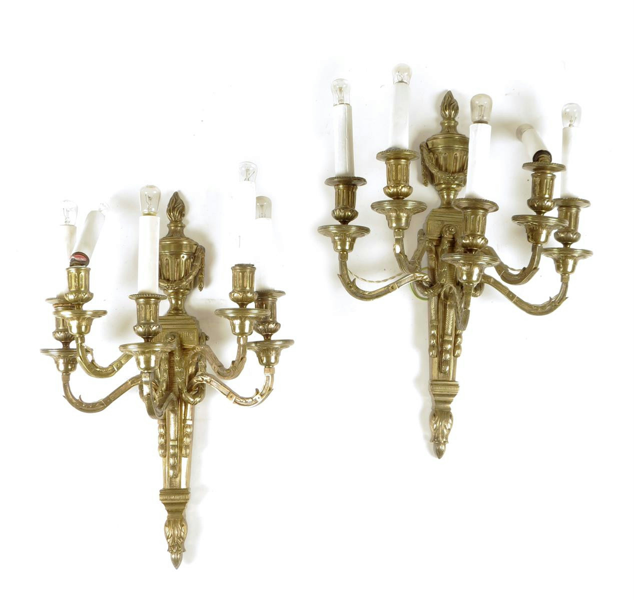A set of four Louis XVI style ormolu wall lights, each with a flaming urn to five scroll arms, 19th century, 53.3cm high, 34.5cm wide, together with a pair of smaller wall lights, all with wooden wall plaques. (6)
