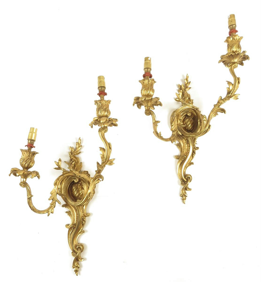 A set of four late 19th century ormolu wall lights in Louis XV style wall lights, each with twin leaf scroll branches, 43.1cm high excluding fittings, 24.5cm wide. (4)