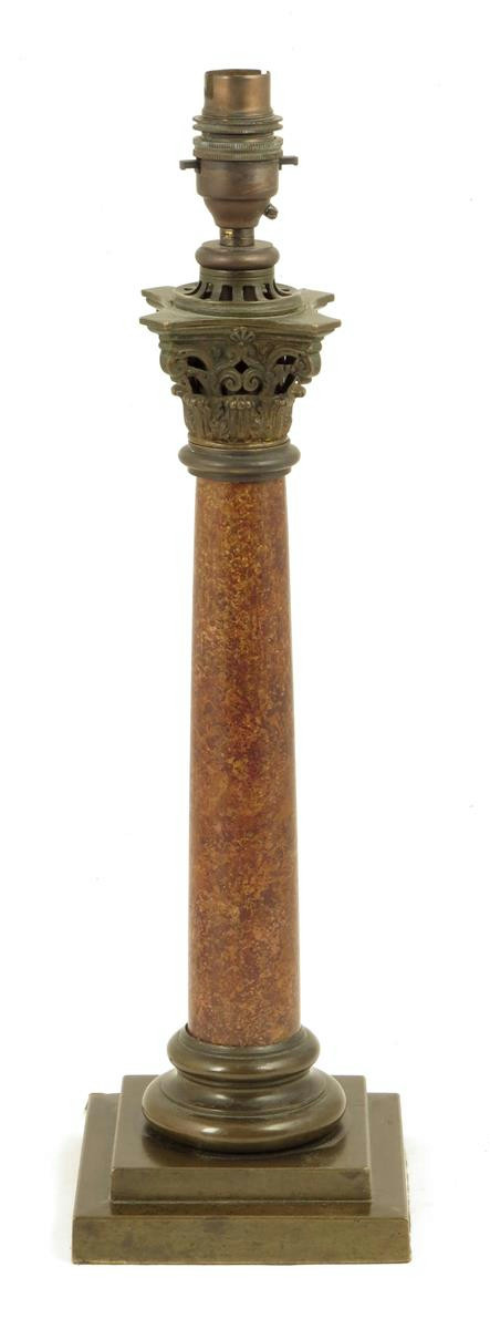 A brass and marble Corinthian column table lamp, on a stepped plinth, 33.8cm high, 12.2cm wide.