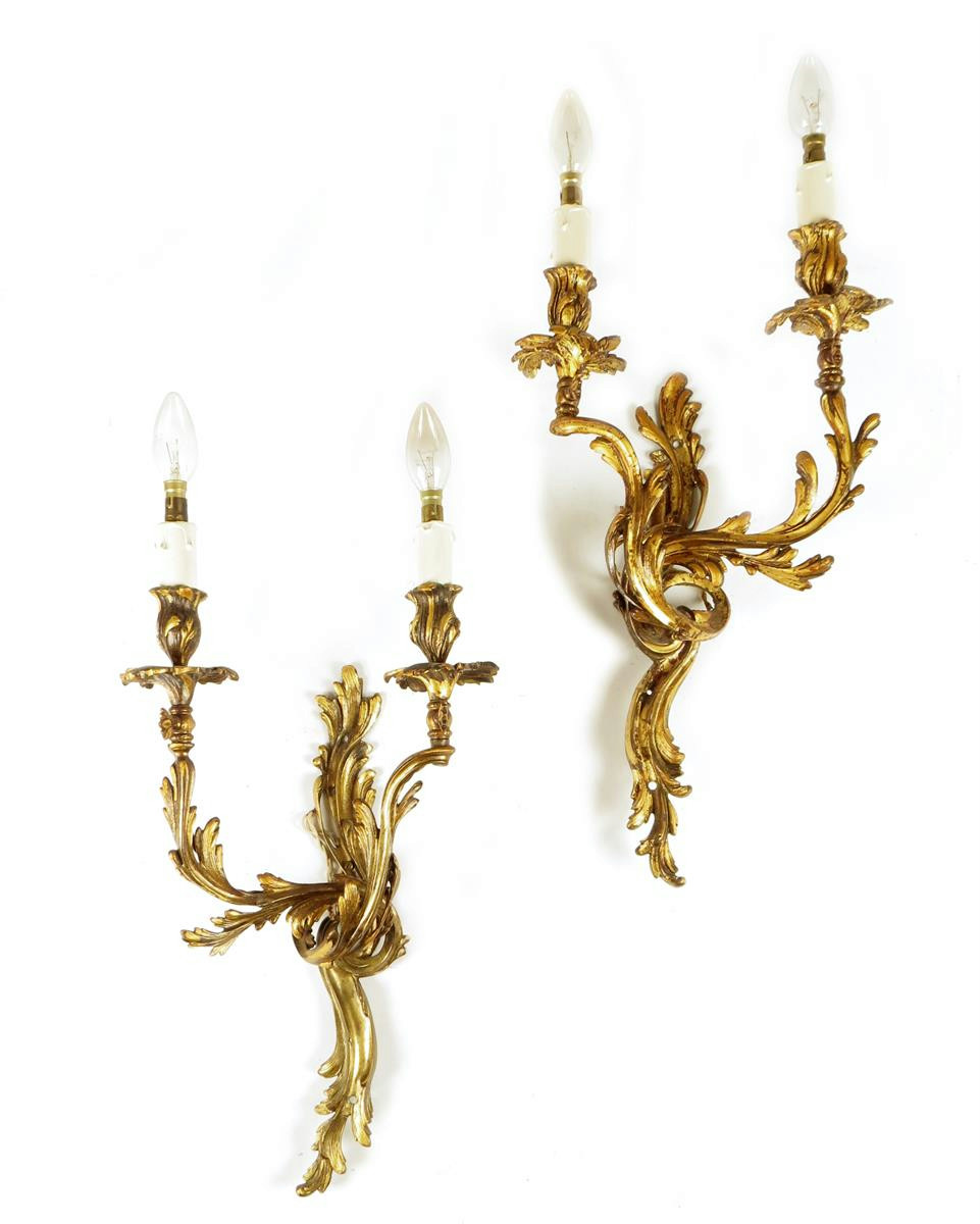 A pair of Louis XV style gilt metal twin branch wall lights