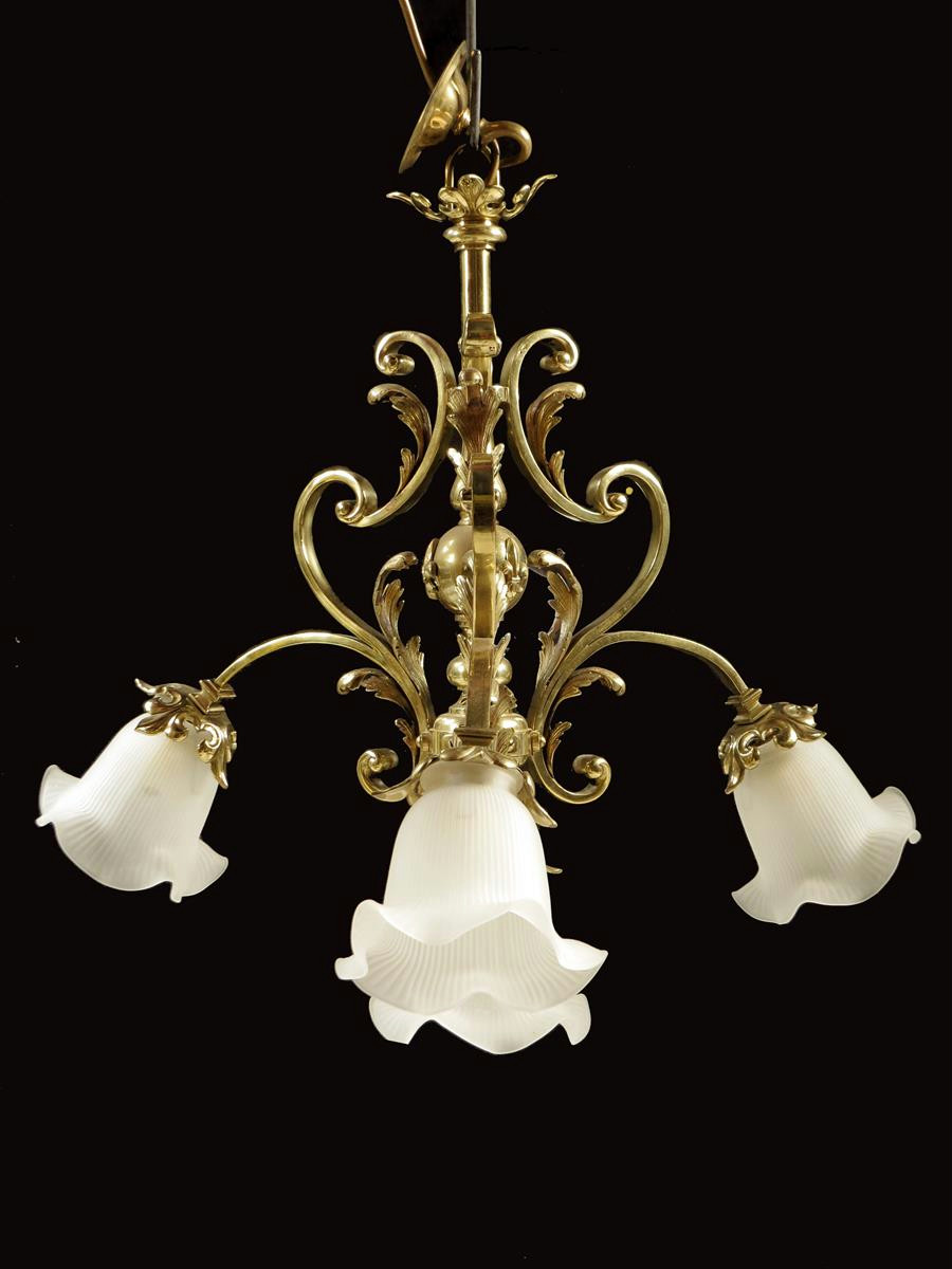 A brass ceiling light, with leaf scroll branches and four lights, with ribbed frosted glass flower head shades, 46cm high, 45cm wide.