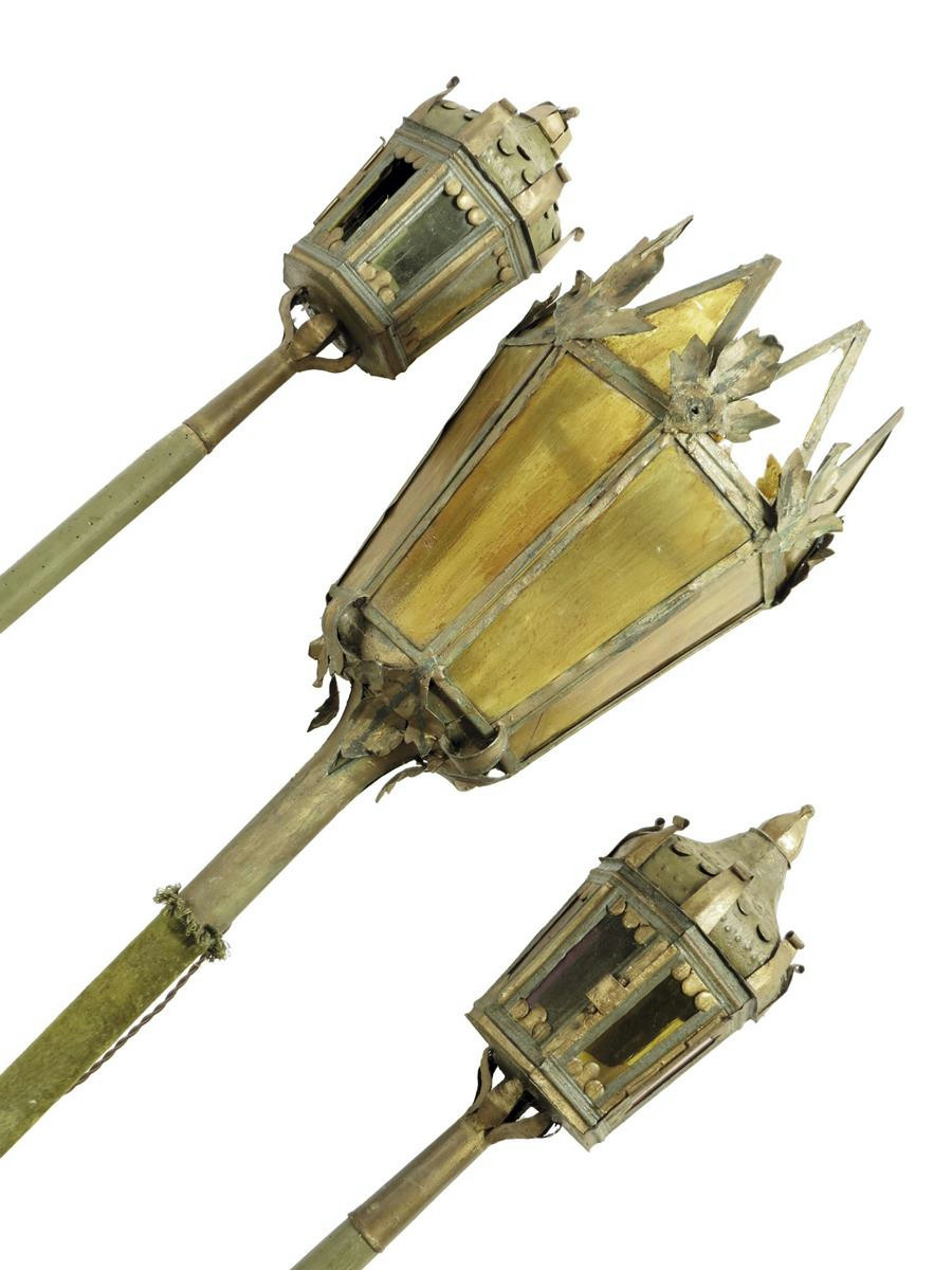 A pair of Italian painted metal and stained glass lanterns in Venetian style