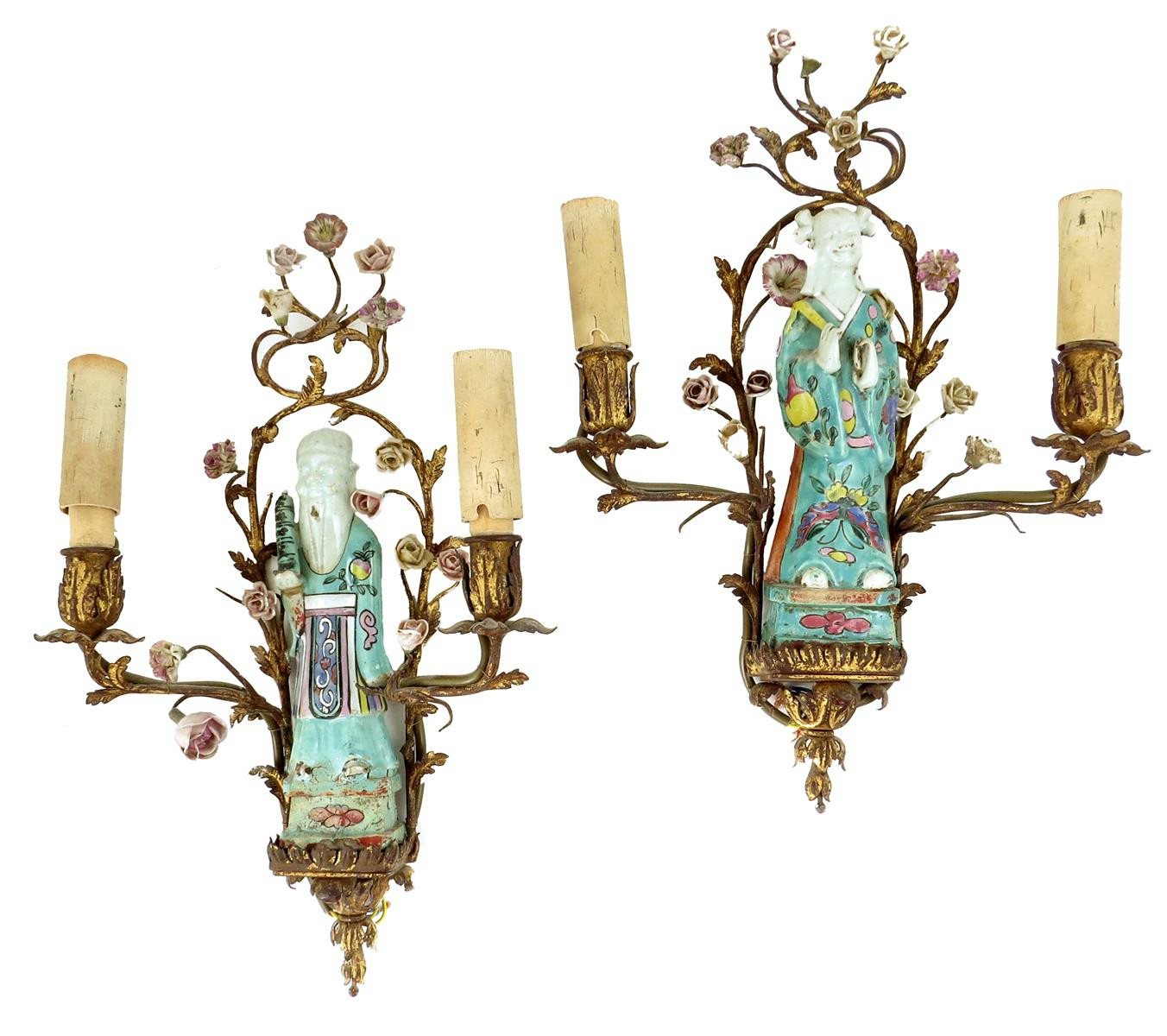 A pair of gilt metal and porcelain mounted twin light wall appliques, each with a turquoise and famille rose Chinese figure standing beneath an arch of flowers with mother of pearl shades, late 19th / early 20th century, 41cm high, 36cm wide. (2)