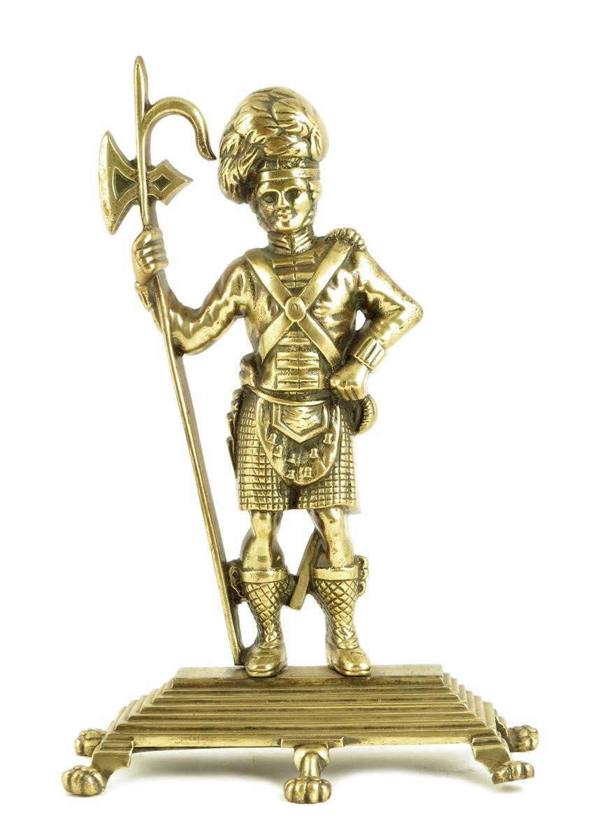 A Victorian brass doorstop, in the form of a standing Scottish Highland soldier, on a stepped base and paw feet, 35.3cm high. 23.8cm wide.