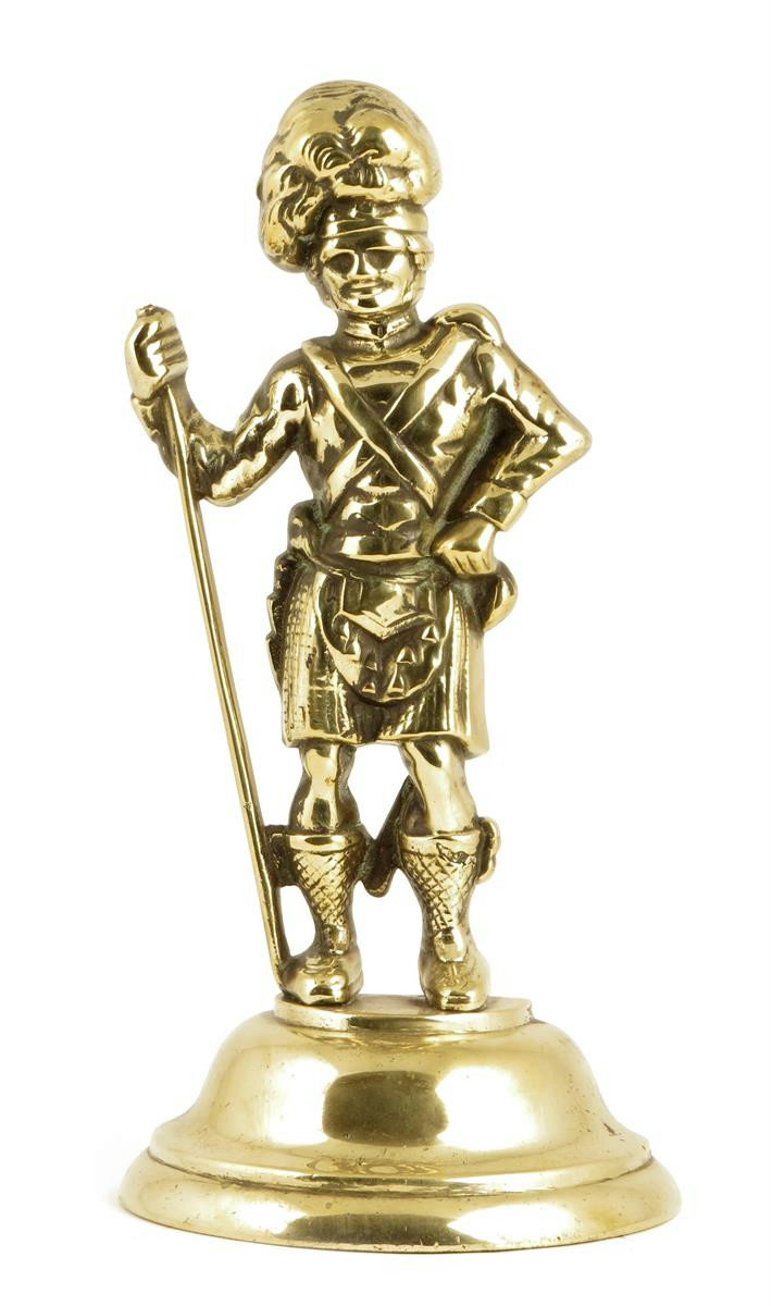 A Victorian brass doorstop, in the form of a standing Scottish Highland soldier, 35.5cm high, 17.3cm wide.