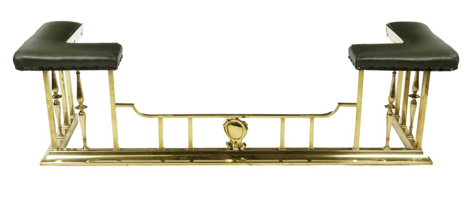 A brass club fender, with green leatherette seats on turned and block supports the front centred a vacant cartouche, 46.1cm high, 158cm wide, 50.5cm deep.