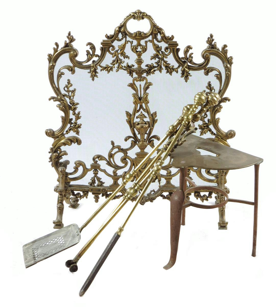 A late 19th century brass fire-screen, 76.3cm high, 67.5cm wide, 22,5cm deep, together with a set of three brass fire tools and a trivet. (5)