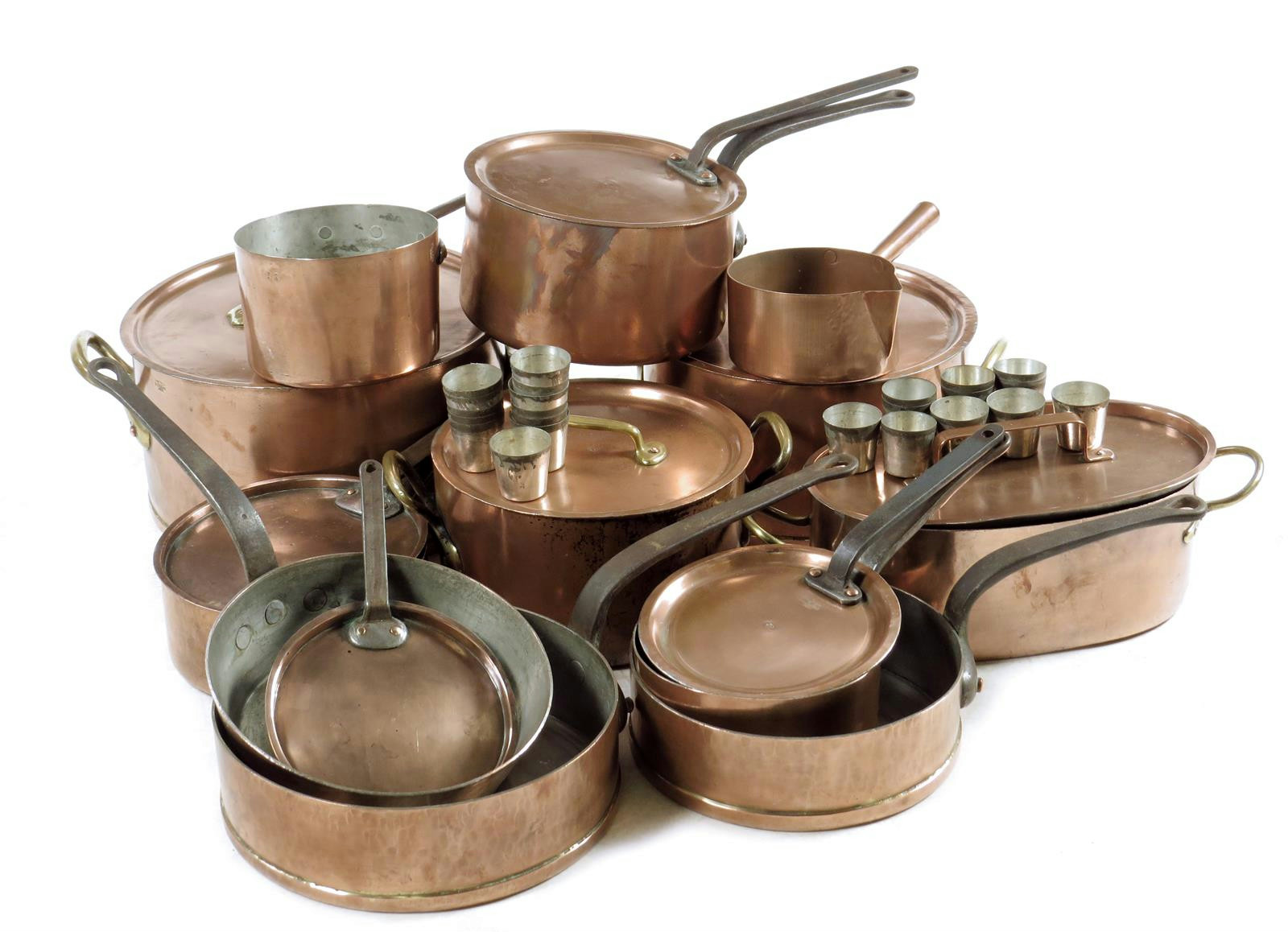 A collection of continental copper pans, the majority with lids, with brass and iron handles, stamped 'PETER, 20, R. FONTAINE, BRUX.' together with twenty three beakers, 68.1cm wide max. (41)