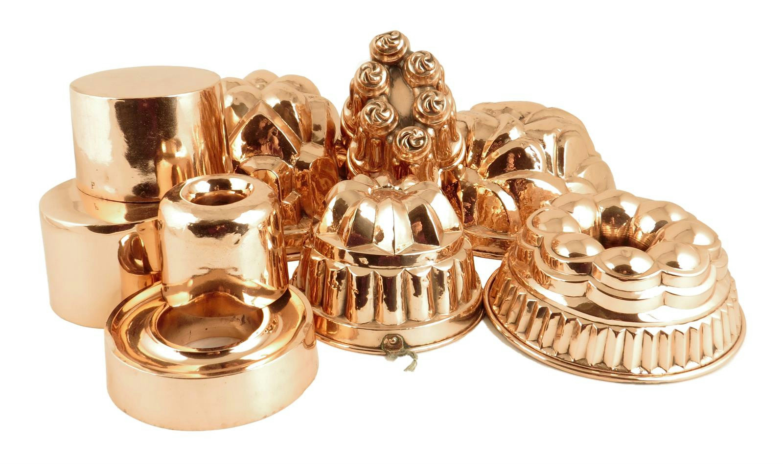 Nine copper jelly moulds, of various designs, one by Benham & Froud, numbered, '619' and with orb and sceptre mark, another stamped 'U.S.C.', 13.5cm high, 23.2cm wide, max. (9).