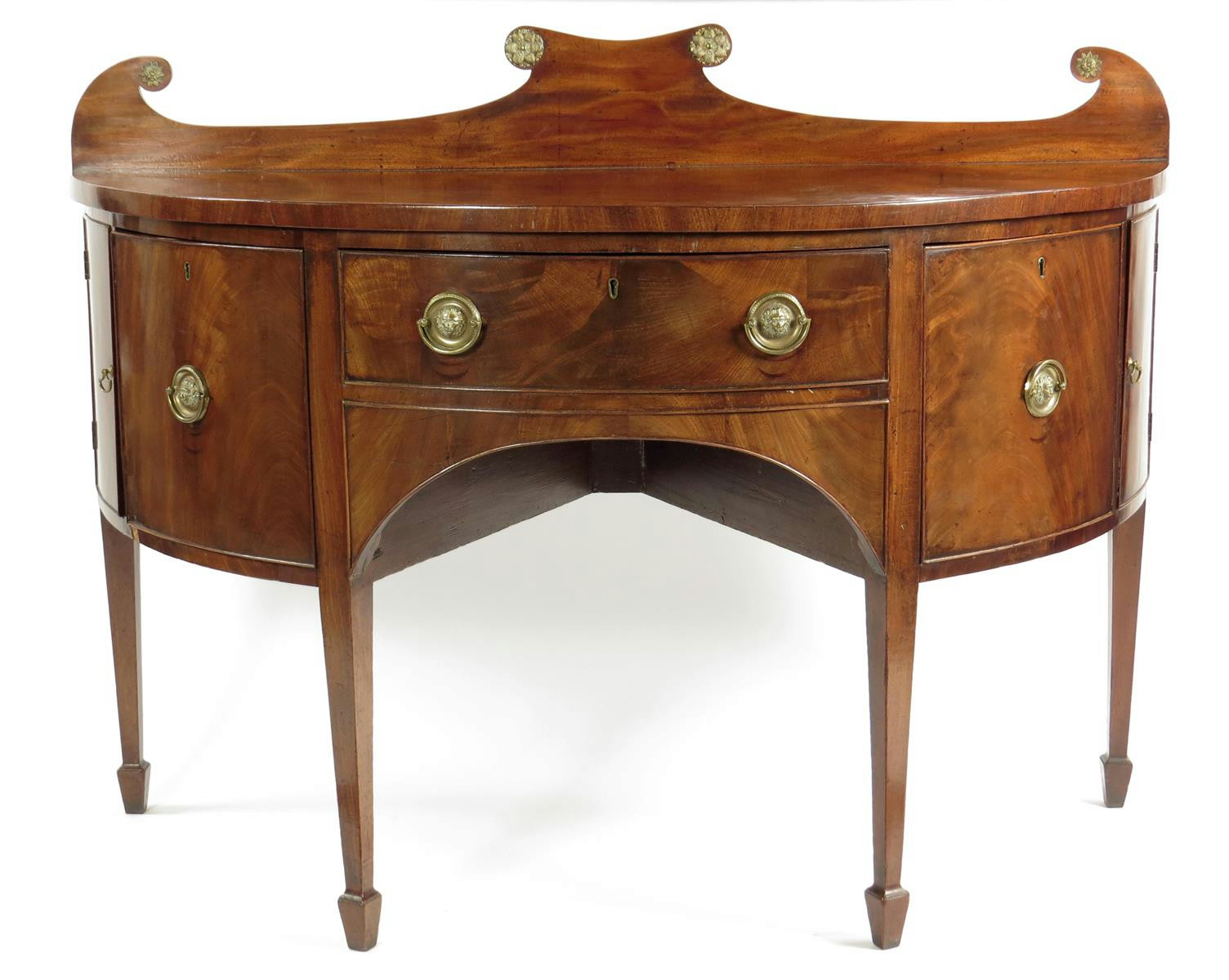 A Regency mahogany demi-lune sideboard, the raised scroll back applied with gilt brass flowerhead rondels, above a central frieze drawer flanked by two deep drawers, one divided, and two cupboards, fitted with later brass handles, on square tapering legs and spade feet, 108cm high, 148.9cm wide, 67cm deep.