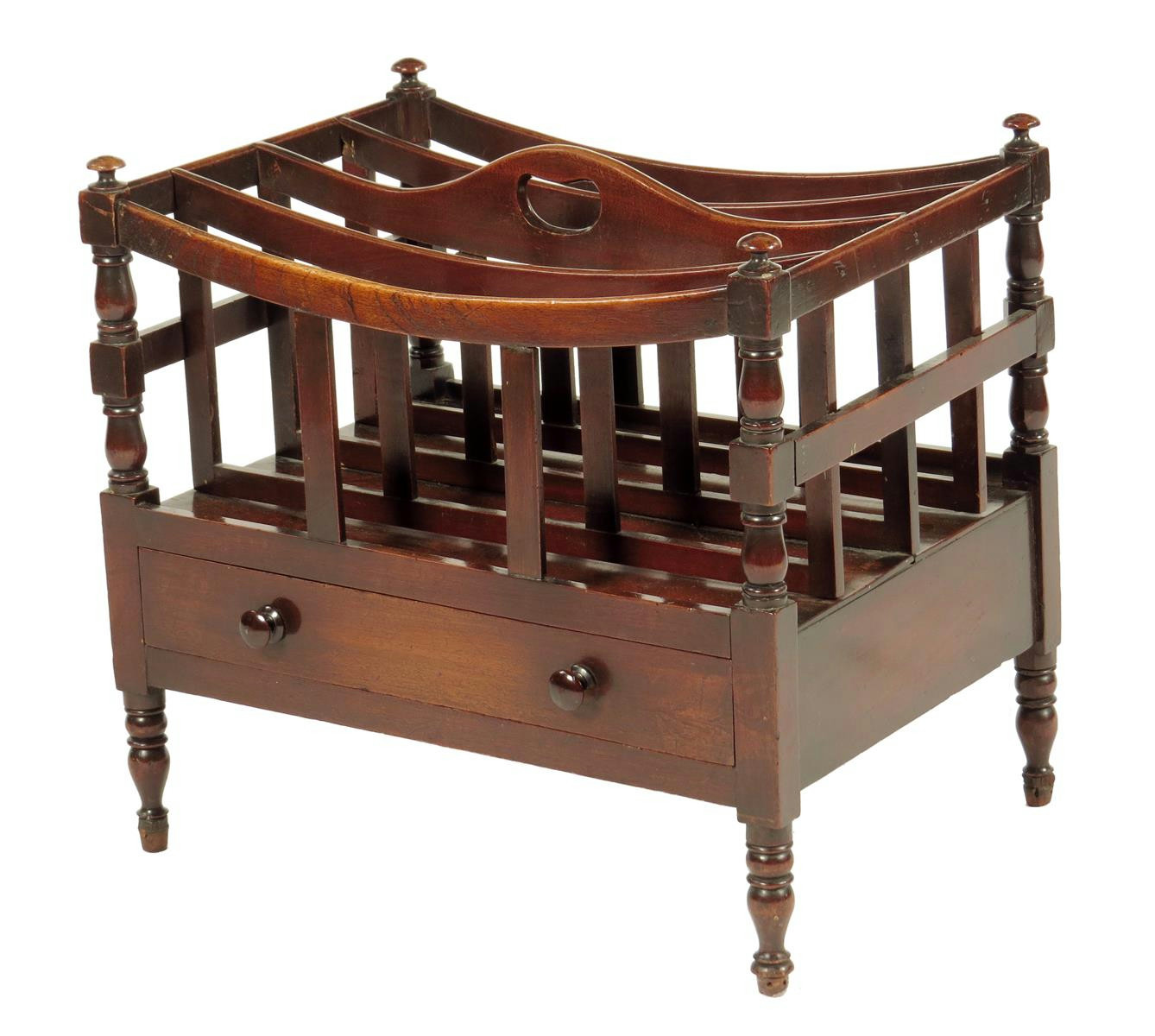 An early 19th century mahogany Canterbury, with four dipped divisions and a central handgrip above a frieze drawer, originally on castors, 43.4cm high, 47.7cm wide, 34.2cm deep.