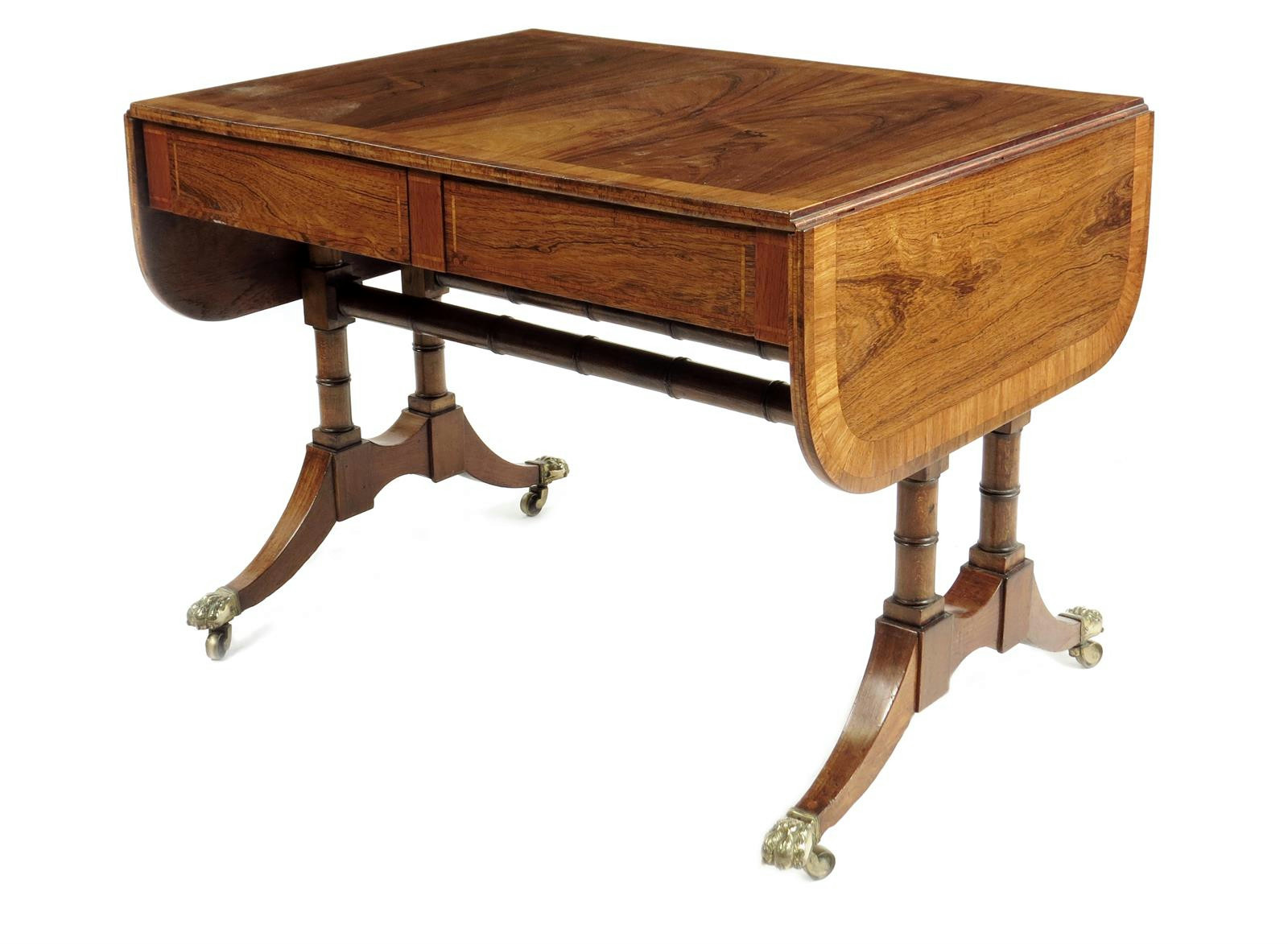 λ A rosewood sofa table, the banded drop-flap top above a pair of frieze drawers, on beech wood ring turned supports and stretchers, with brass paw, sabots and castors, stamped 'KEEBLE LTD LONDON', early 19th century and later, 72.4cm high, 97.4cm wide, 71cm deep.