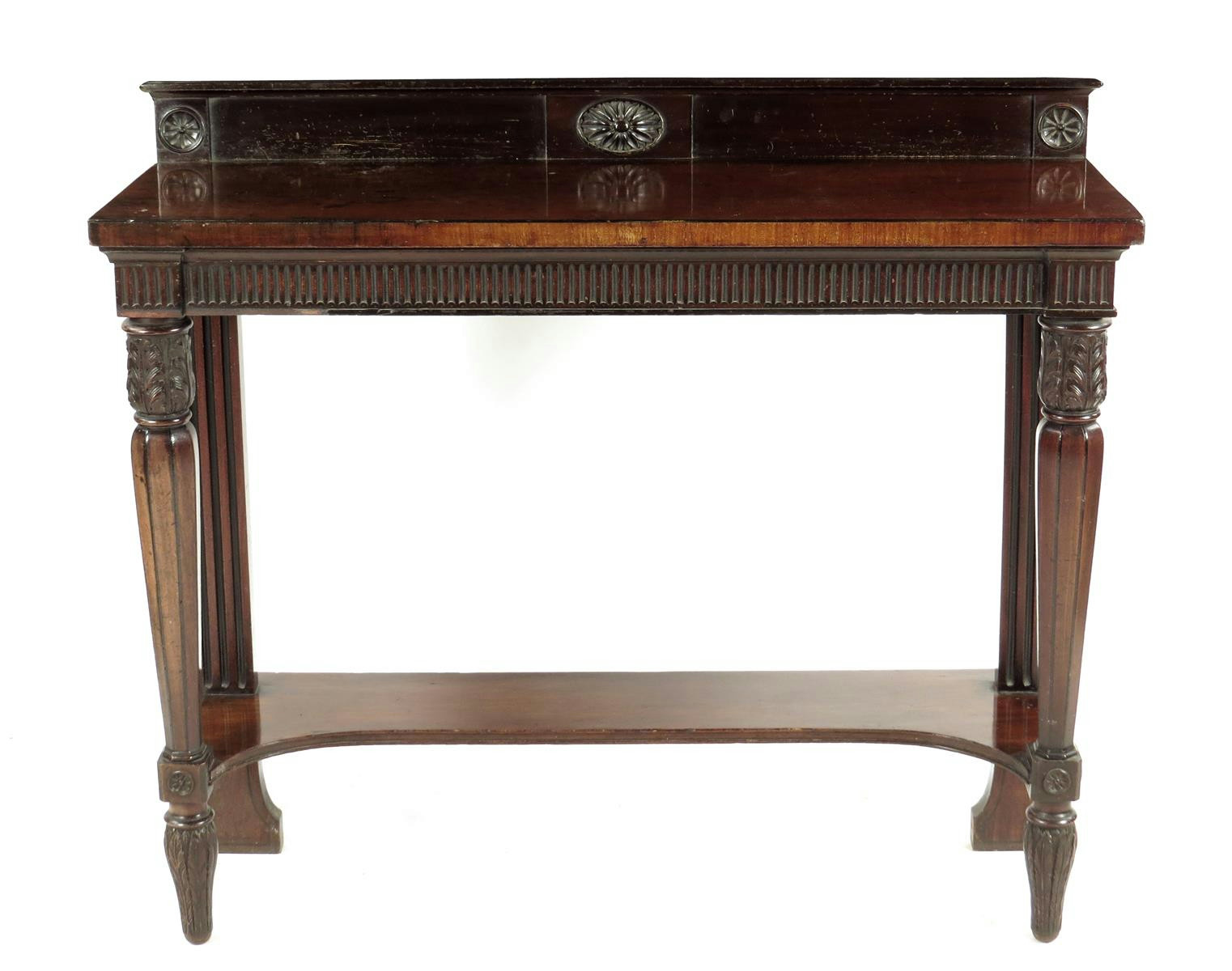 An early 19th century mahogany console table, inlaid ebonised stringing the later raised back with a central patera and end rondels above a fluted frieze on acanthus carved and faceted tapering front legs and fluted block back legs, united by an undertier, with some alterations, 100.5cm high, 118cm wide, 40cm deep.