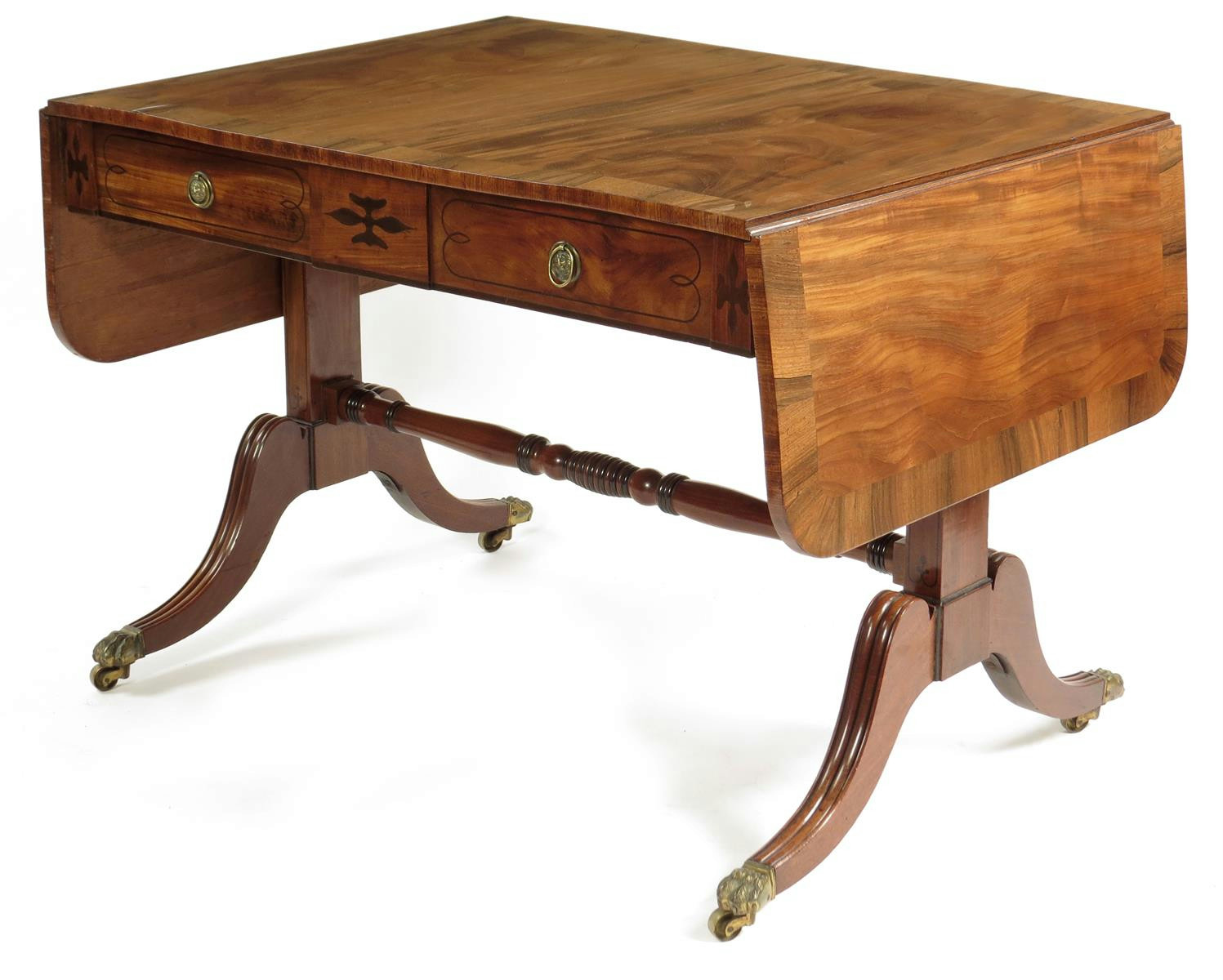 λ A late Regency mahogany sofa table, with ebonised stringing, the drop-leaf top crossbanded in rosewood, above two frieze drawers fitted with lion's mask handles, with false front to the reverse, with solid trestle ends united by a turned stretcher on gilt brass paw sabots and castors, 72.1cm high, 101cm closed, 76cm deep.