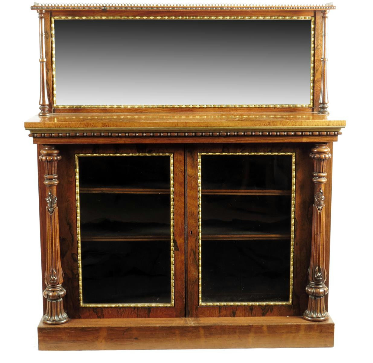 λ A George IV rosewood and giltwood side cabinet attributed to Gillows, the raised mirror back with a brass gallery on turned columns to an amboyna top above a pair of glazed doors enclosing two adjustable shelves, the brass hinges stamped 'HORNE PATENT', flanked by leaf carved columns on a plinth base, 136cm high, 121.8cm wide, 37.4cm deep.