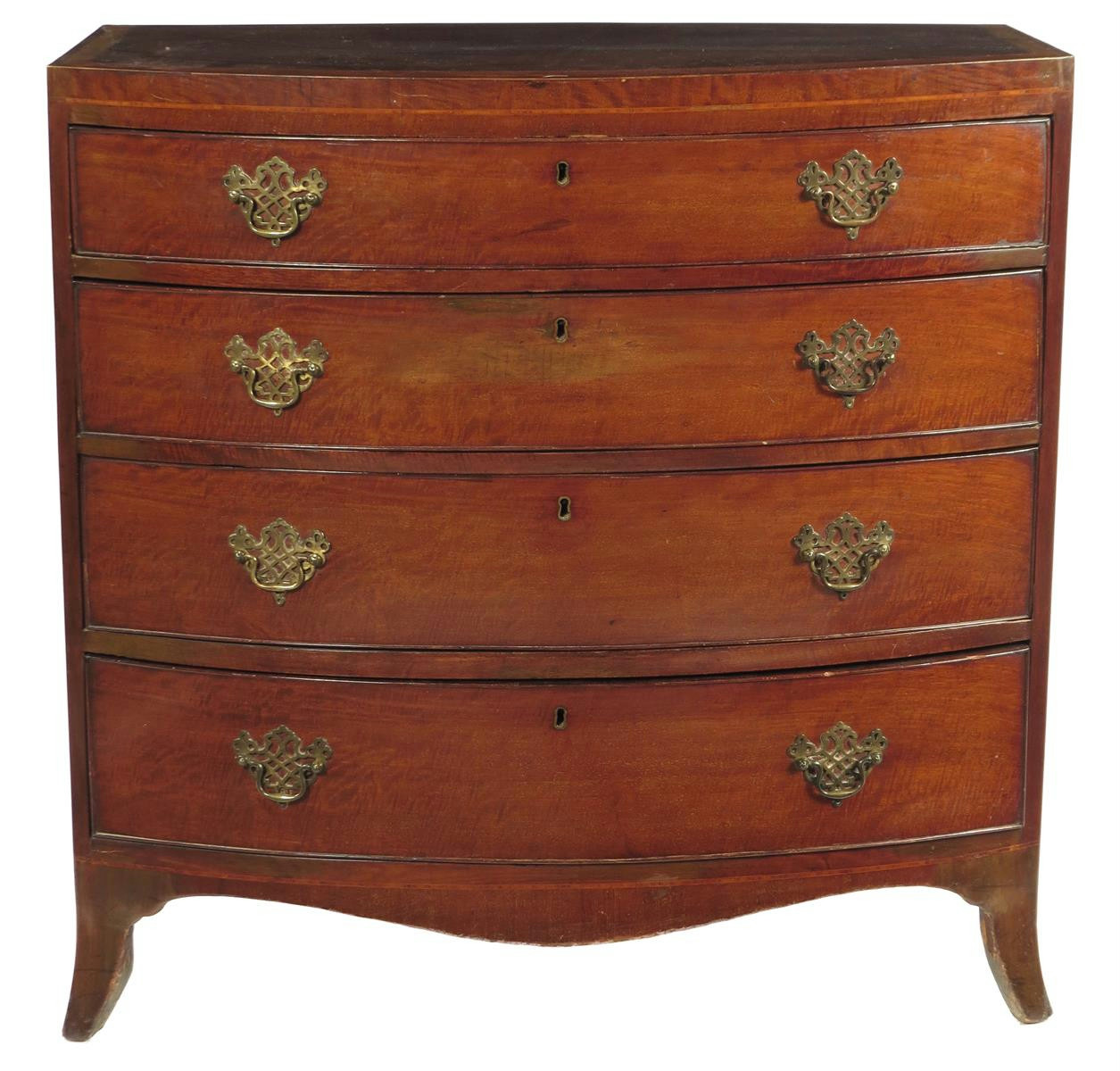 An early 19th century mahogany bowfront chest, the satinwood and tulipwood banded top above four long graduated drawers fitted with later brass handles, on swept feet, 90.6cm high, 94.5cm wide, 52.7cm deep.