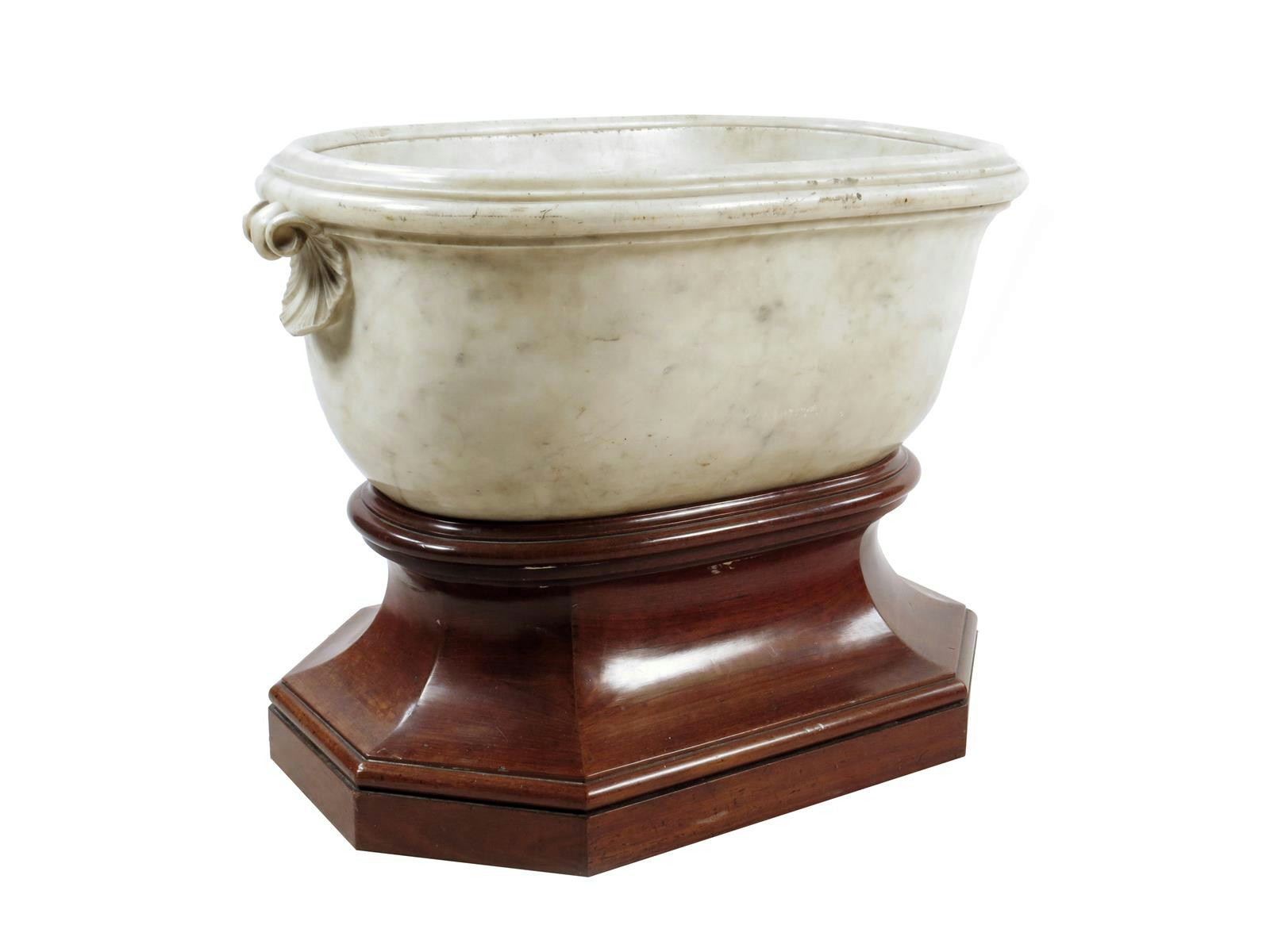 An 18th century carved carrara marble wine cooler, with a moulded rim to a pair of carved shell scroll lifts, on an early 19th century mahogany stand with a faceted base to sunken brass castors, the wine cooler 30cm high, 68.5cm wide, 44.5cm deep, on the stand 53cm high, 68.5cm wide, 44.5cm deep. (2)