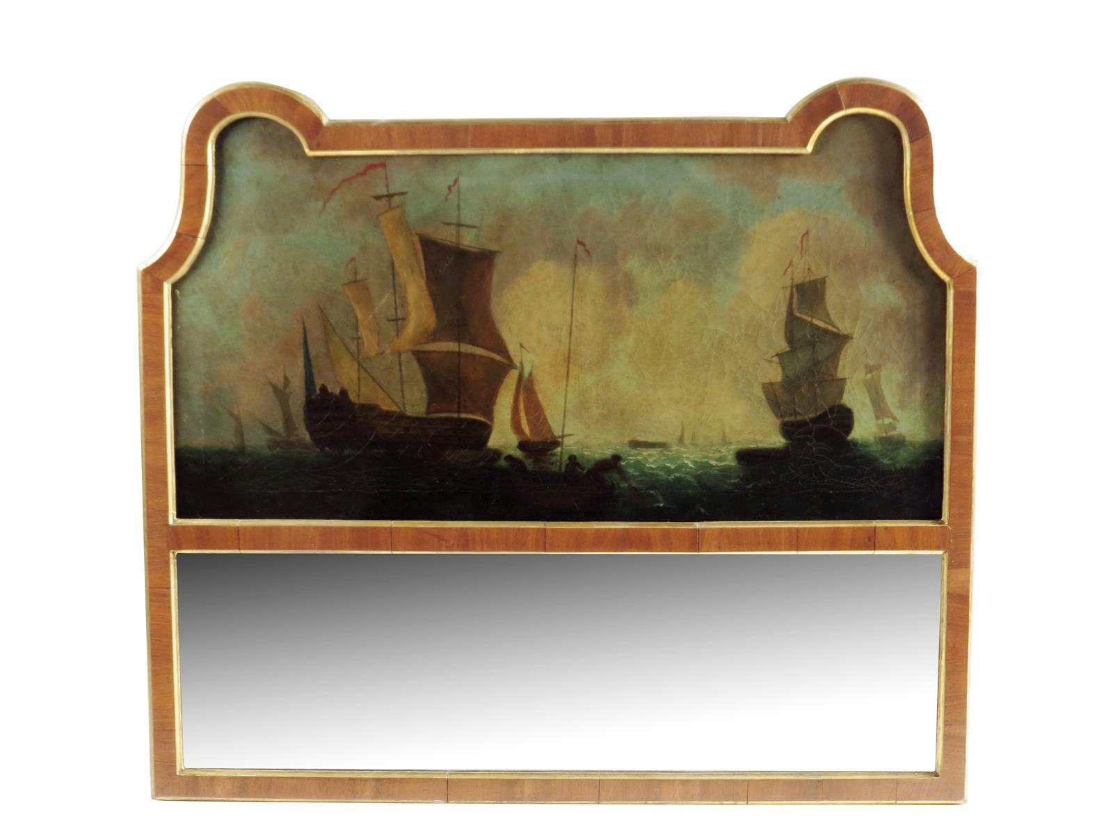A late 19th century walnut and parcel gilt trumeau, with a rectangular plate surmounted by an oil on canvas marine scene, 92 x 105.2cm.