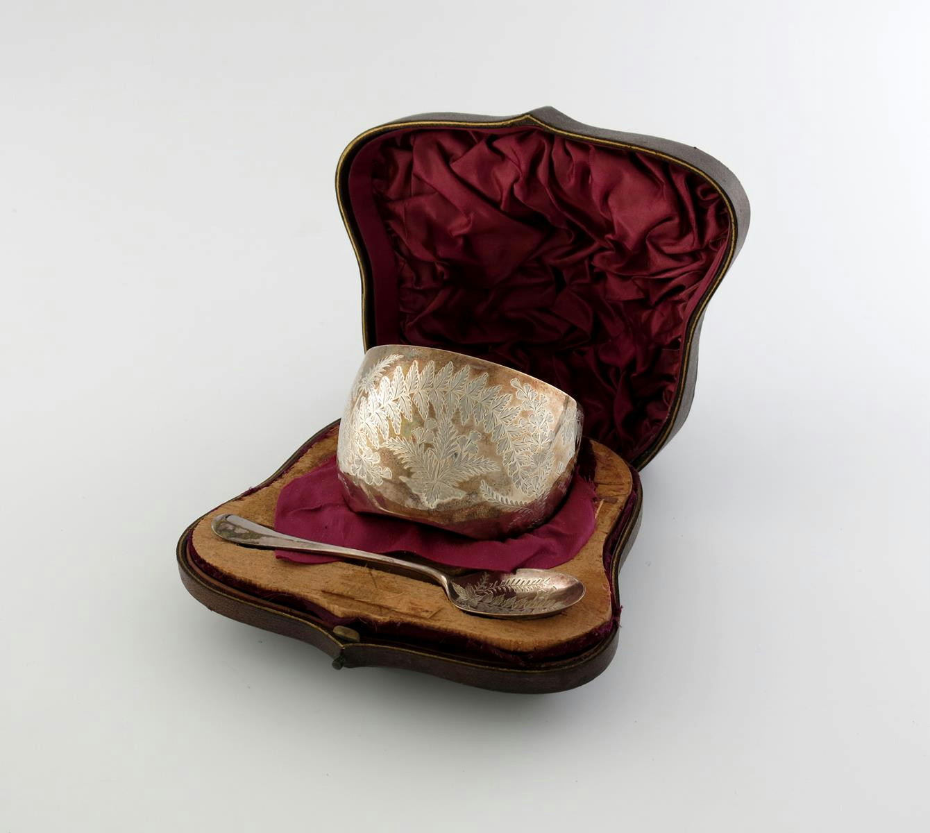 circular form, engraved fern decoration, with a presentation inscription, in a fitted case, a.f, approx. weight 4oz.