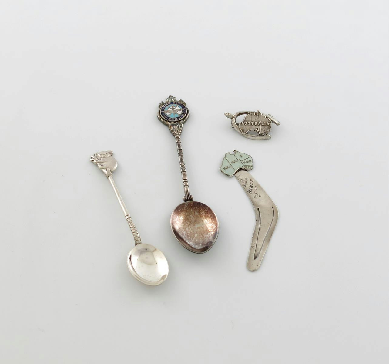 comprising; a silver page marker, modelled as a boomerang, with an enamelled map of Australia, and inscribed and dated '27', plus a teaspoon, an English made brooch with a map of Australia and an electroplated spoon, the terminal enamelled with the badge of the Australia Royal Flying Doctors Service. (4)
