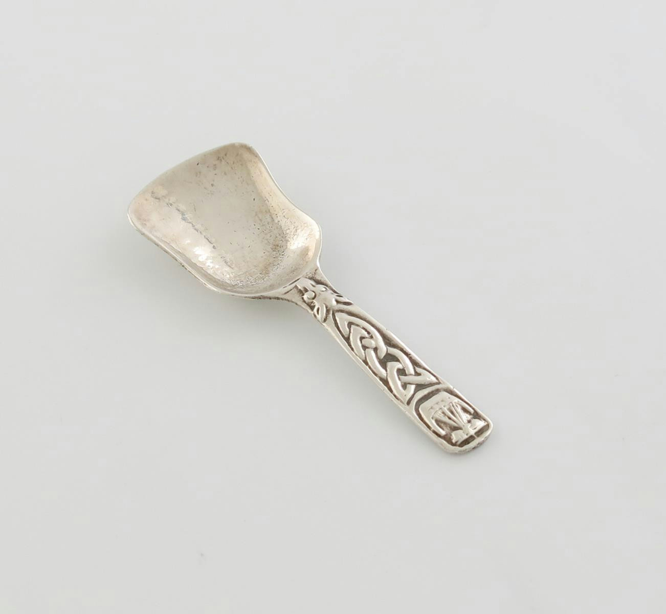 the handle with a intertwined Celtic decoration and a longboat, shovel shaped bowl, length 8.3cm, approx. weight 0.4oz.
