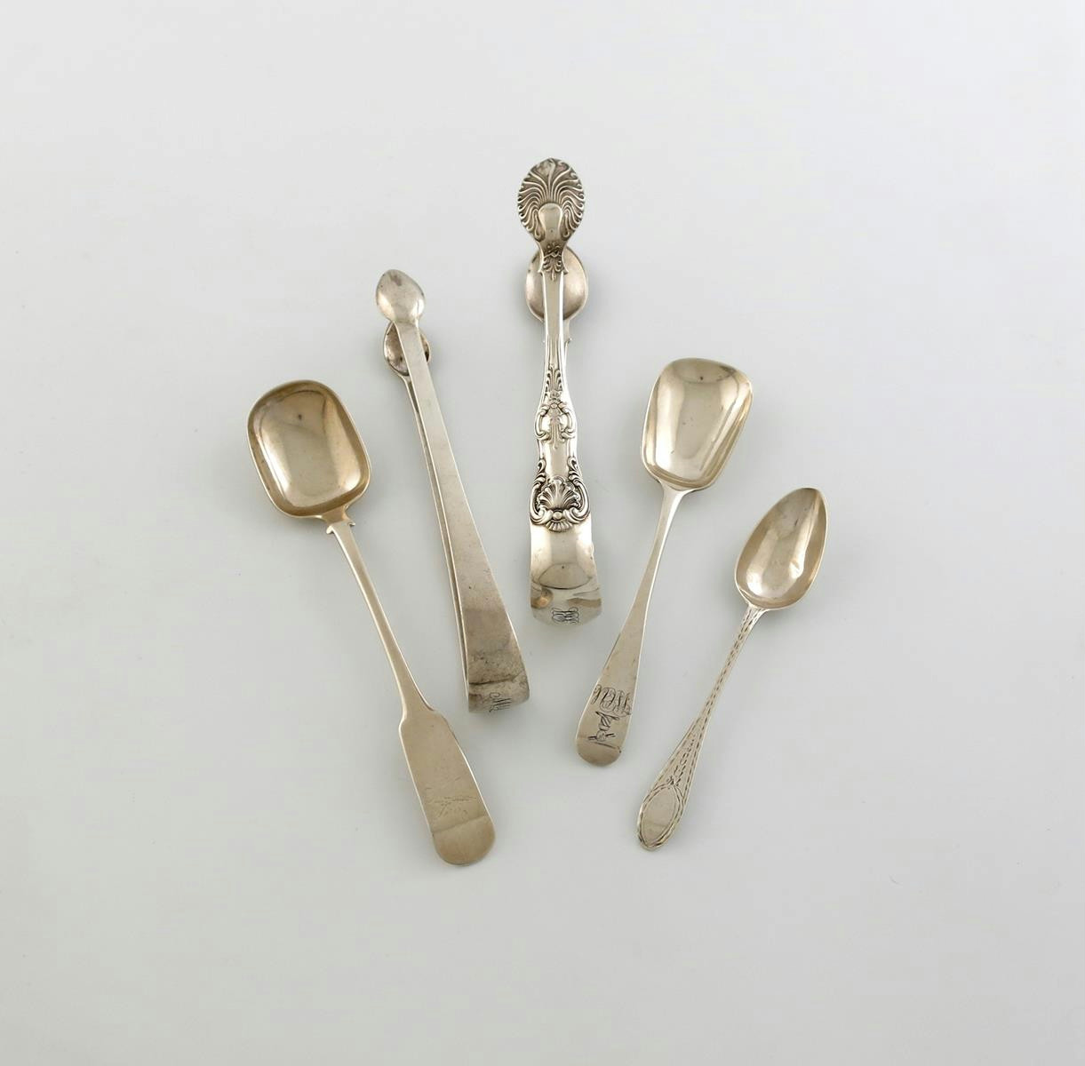 comprising: a Scottish provincial Fiddle pattern sugar spoon, by William Whitecross, Aberdeen, circa 1810, an Exeter sugar spoon, two pairs of Scottish sugar tongs, and an Irish bright-cut teaspoon, marked Sterling, approx. weight 4.7oz. (5)