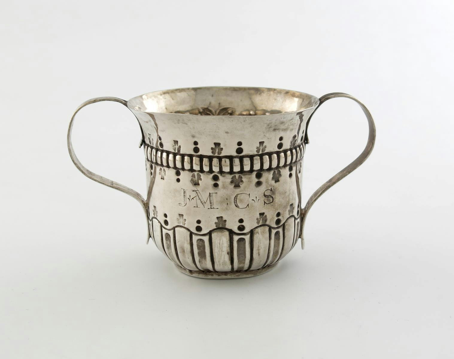 circular form, part-fluted decoration, rope-wok girdle, scroll handles, scratch initialled 'J*M' and 'C*S', height 7.5cm, approx. weight 2.8oz.