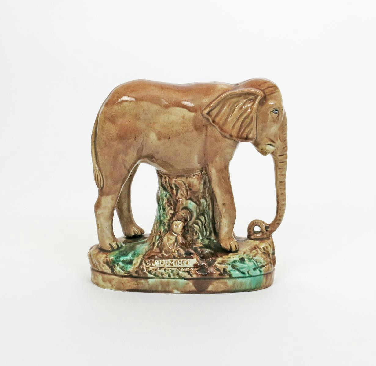 Cf. P D Gordon Pugh, Staffordshire Portrait Figures, p.426. Jumbo became the highlight of Phileas Barnum's circus in 1882, touring the US and Canada. On September 15th 1885 Jumbo was hit by a train, which was derailed, crushing him to death and breaking his skull in over a hundred places. Barnum had a taxidermist immortalize the 6 ton elephant and later told the world that Jumbo had charged the train in an attempt to save Alice, a smaller beast whom he billed as Jumbo's 'widow'.