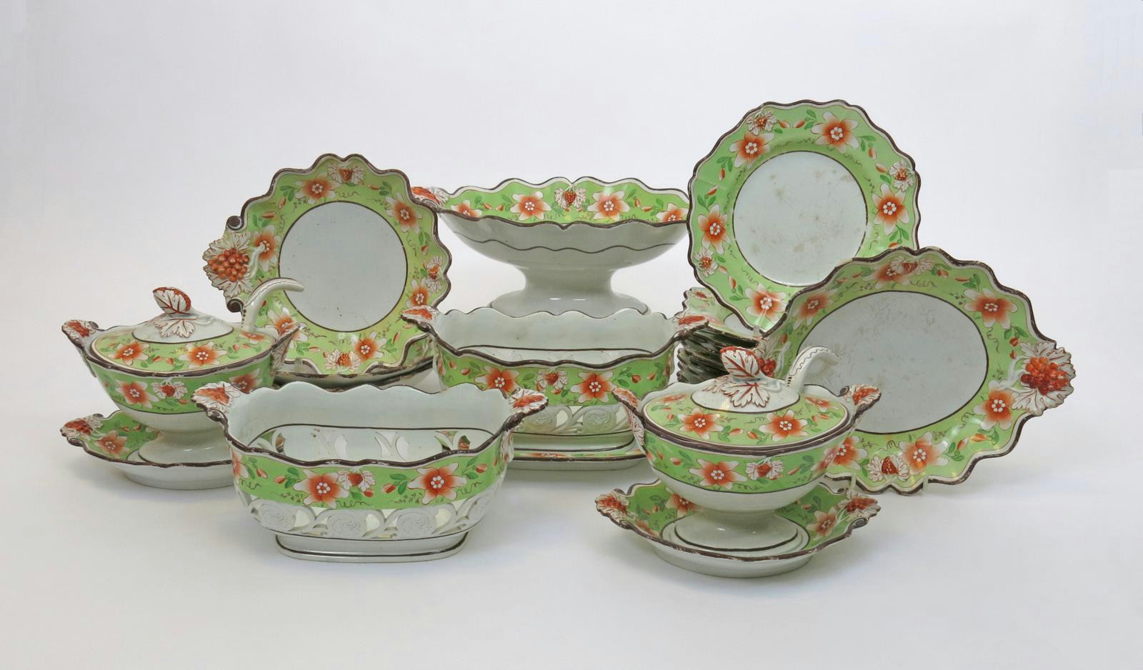 A pearlware part dessert service c.1800, probably Wedgwood, decorated with stylized orange flowers reserved on an apple green ground, some damages. Comprising: two sauce tureens with covers and ladles, two baskets, one stand, a comport, three shell-shaped dishes, a two-handled dish, and nine plates. (23)