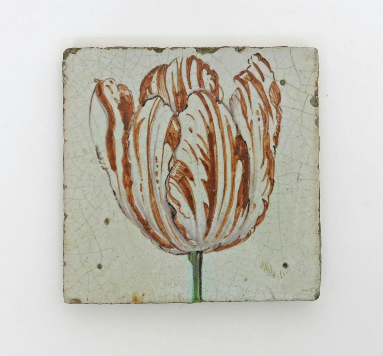 A rare Dutch 'Hoorn' botanical tile c.1630-50, probably Haarlem, painted with a large striped red and white tulip with faint manganese detailing, 12.8cm.