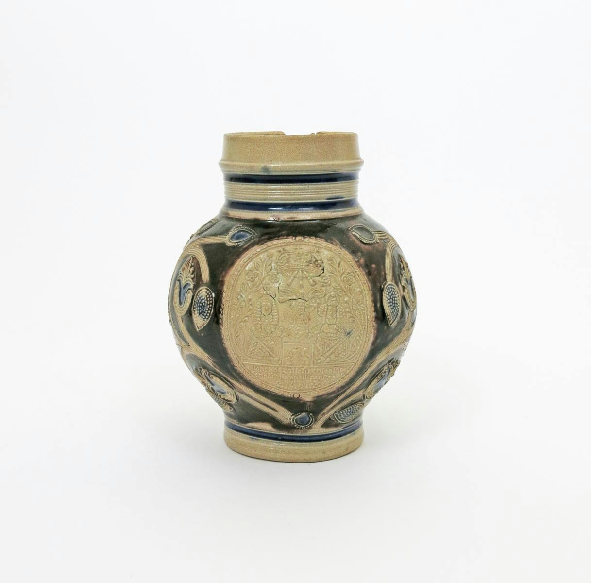 A Westerwald stoneware Royal jug dated 1691, applied with a roundel moulded with the portraits of William of Orange and Queen Mary in coronation robes, a trumpeting herald between them, above the inscription 'Uifonschollanffe Tuynloo Bloof enorinicappellenenRoofen' (In our Dutch garden bloom oranges and roses), reserved on a ground of applied and incised tulips and other flowers, the body glazed in manganese, a chip to the rim, 17.5cm.