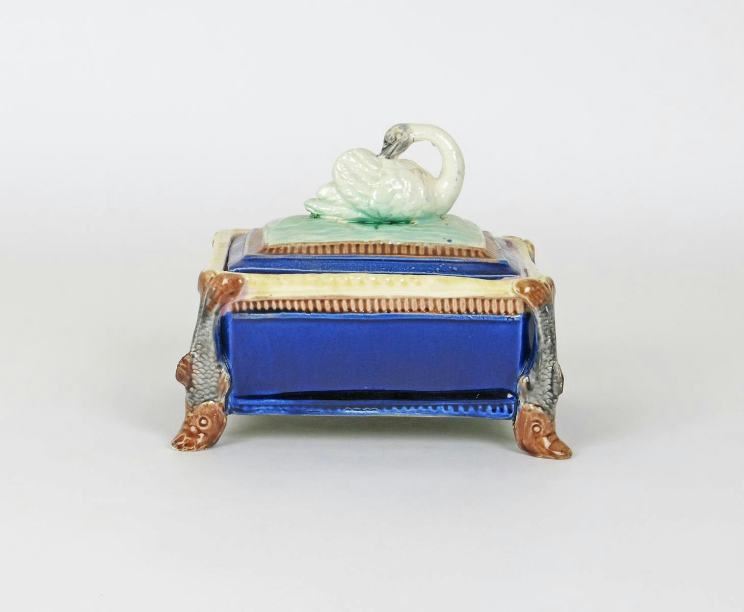 A Majolica sardine pot and cover 19th century, the rectangular base supported on four feet formed from long fish, the cover surmounted with a swan swimming among waterlilies, 17cm across. (2)