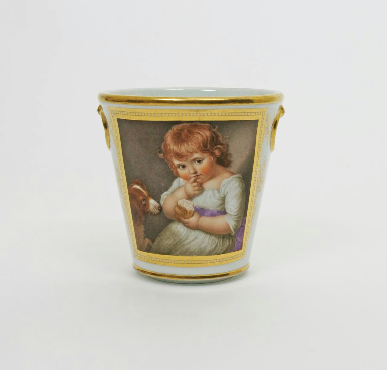 A rare Flight and Barr câchepot c.1800-10, finely painted by John Pennington with a young girl wearing a white dress with a purple sash, eating bread while her spaniel watches and waits hopefully, the flared form applied with ring handles and decorated with a continuous foliate band to the rim, a small chip to the foot, 14cm.