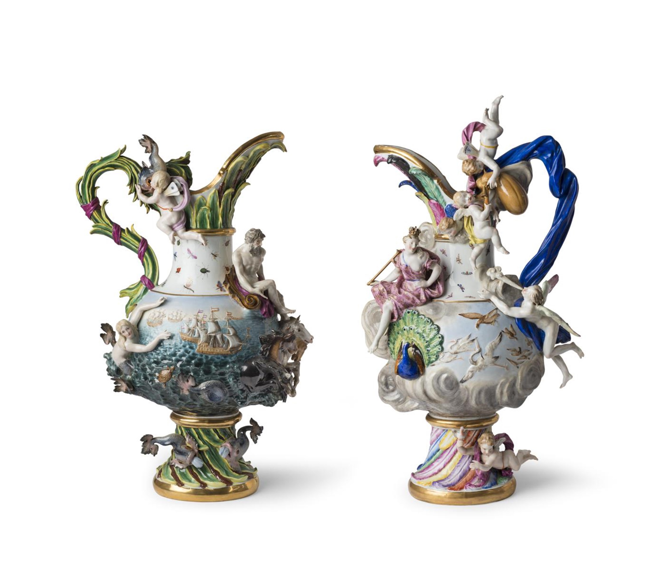 This pair of ewers directly copy a white-glazed pair sent to the French Court in 1742 as a diplomatic gift to Louis XV, together with a pair of vases emblematic of Earth and Fire, and a third vase bearing the King's portrait. Later sets turned the two vases into ewers to match those of Water and Air.