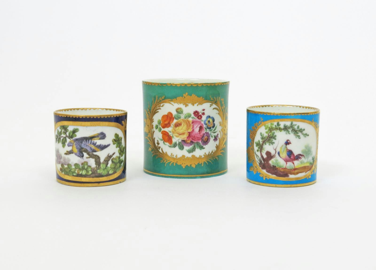 Two Sèvres-style cylindrical jars or pots and a miniature coffee can probably 19th century, the larger cylindrical pot painted with floral panels reserved on a green ground, the smaller and the can with panels of fancy birds reserved on a turquoise and a blue ground, interlaced LL marks, 6.6cm max. (3)