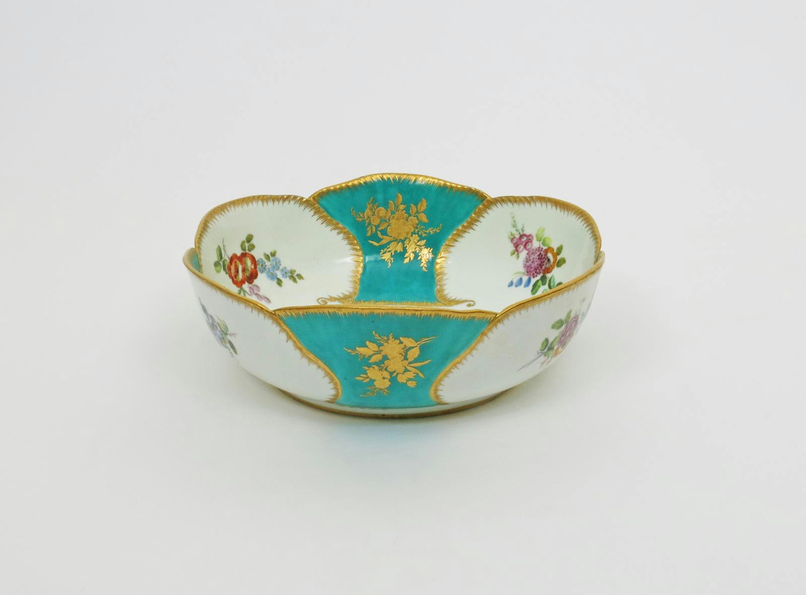 A large Sèvres-style bowl or saladier 18th/19th century, of lobed hexafoil shape, painted with sprays of European flowers in a muted palette with alternate panels of gilt arrangements reserved on a green ground, interlaced LL and D mark, 26.5cm.