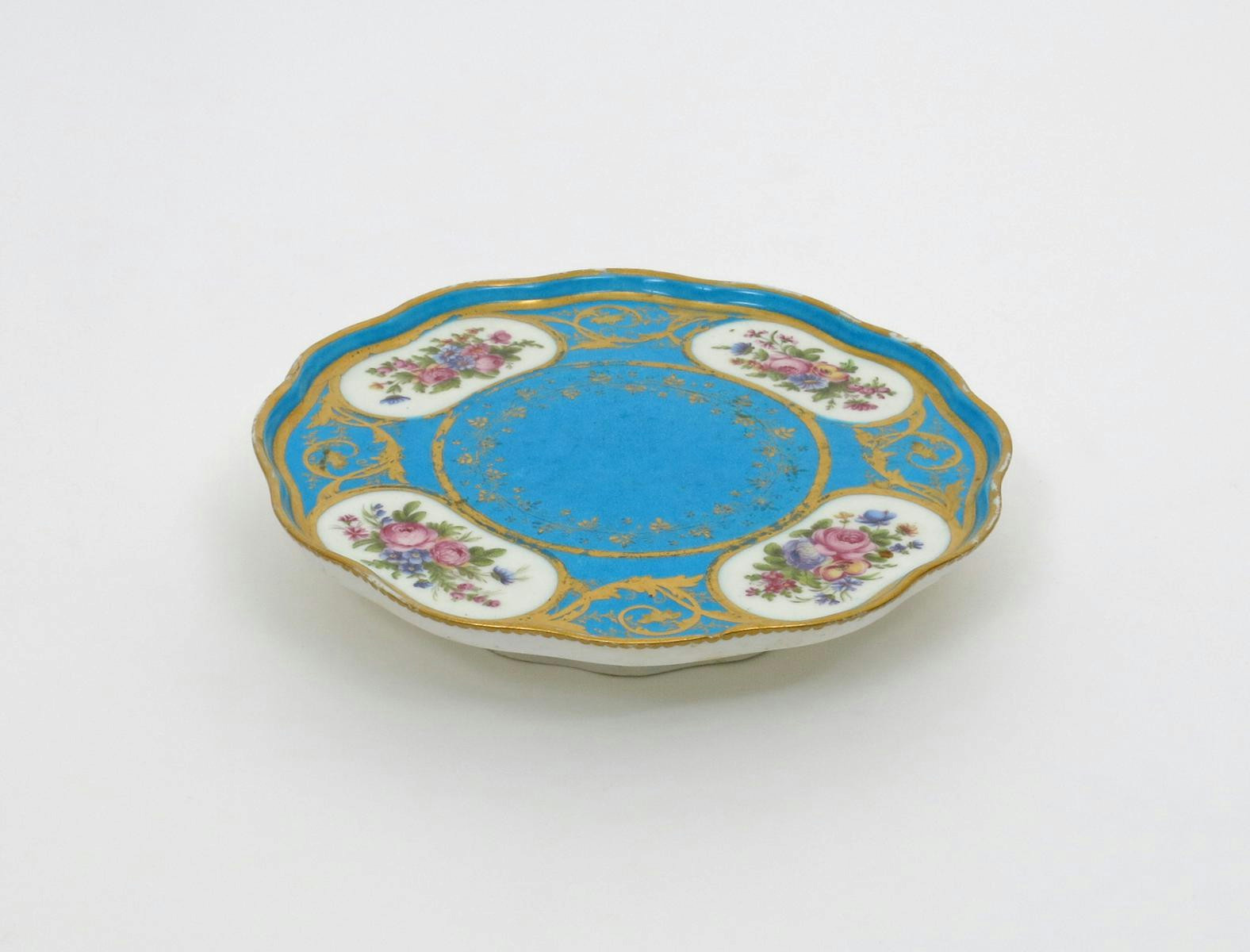 A Sèvres tasse à glace stand date code for 1765, painted with four panels of flowers linked by gilt foliate scrolls, reserved on a bleu celeste ground, raised on a low foot, a small restuck rim chip, 22cm.
