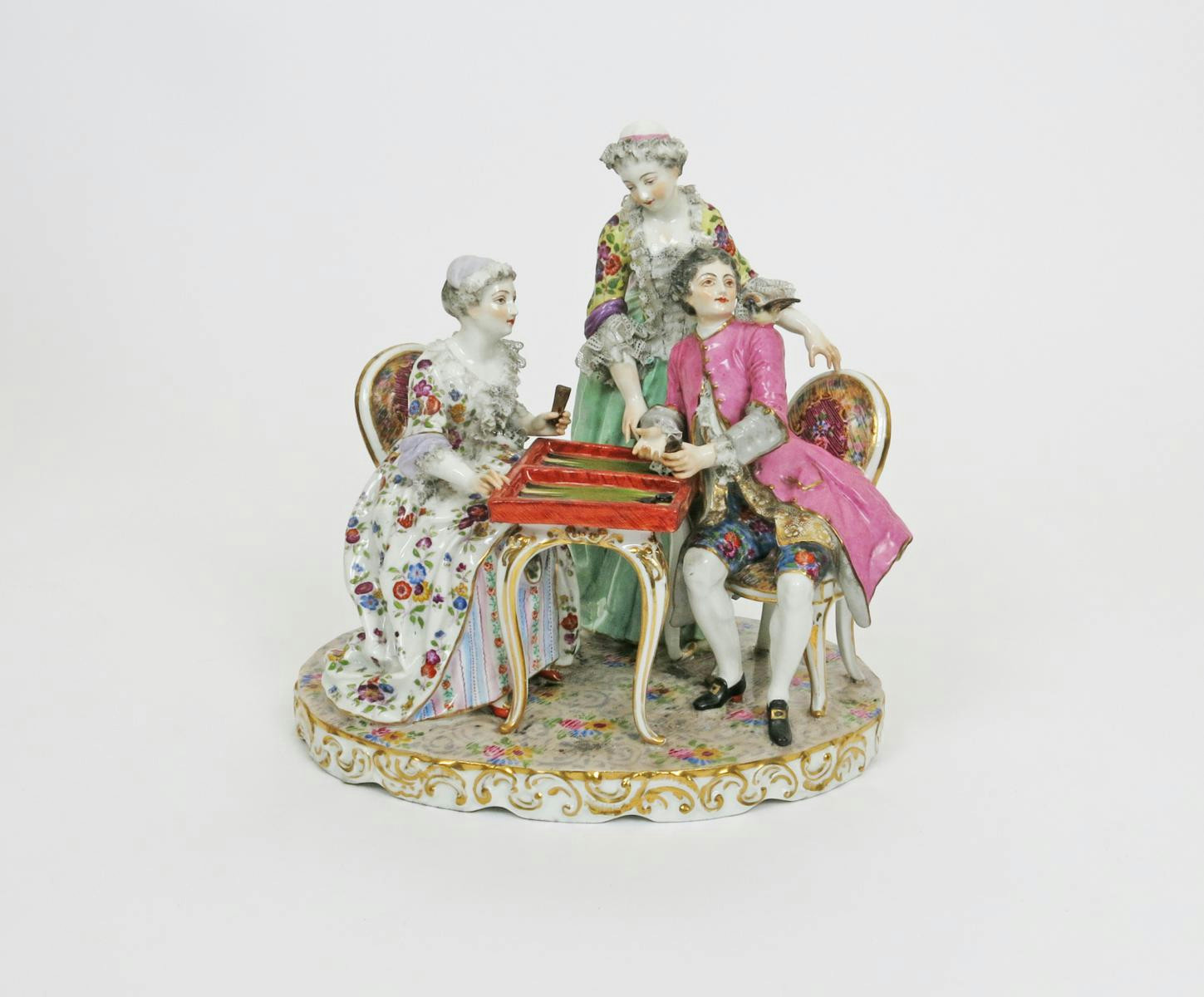 A Samson porcelain figure group late 19th century, in the Meissen manner, of a gentleman and two ladies playing backgammon, seated on plush chairs, a small bird alighted on the gentleman's shoulder, pseudo blue crossed swords mark, 23.5cm. Contained in a contemporary fitted case bearing a shield with three fleur de lys.