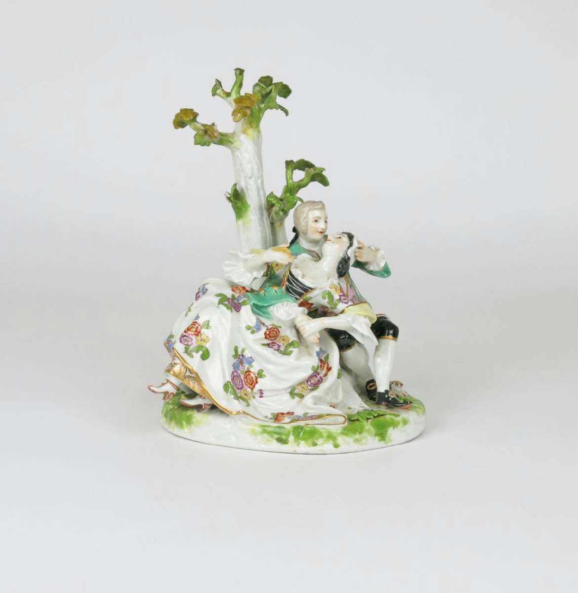 A Meissen crinoline group of lovers c.1770, modelled by J J Kändler, the amorous pair seated beneath a tree and enjoying an embrace, blue crossed swords and dot mark, some restorations, 19cm.