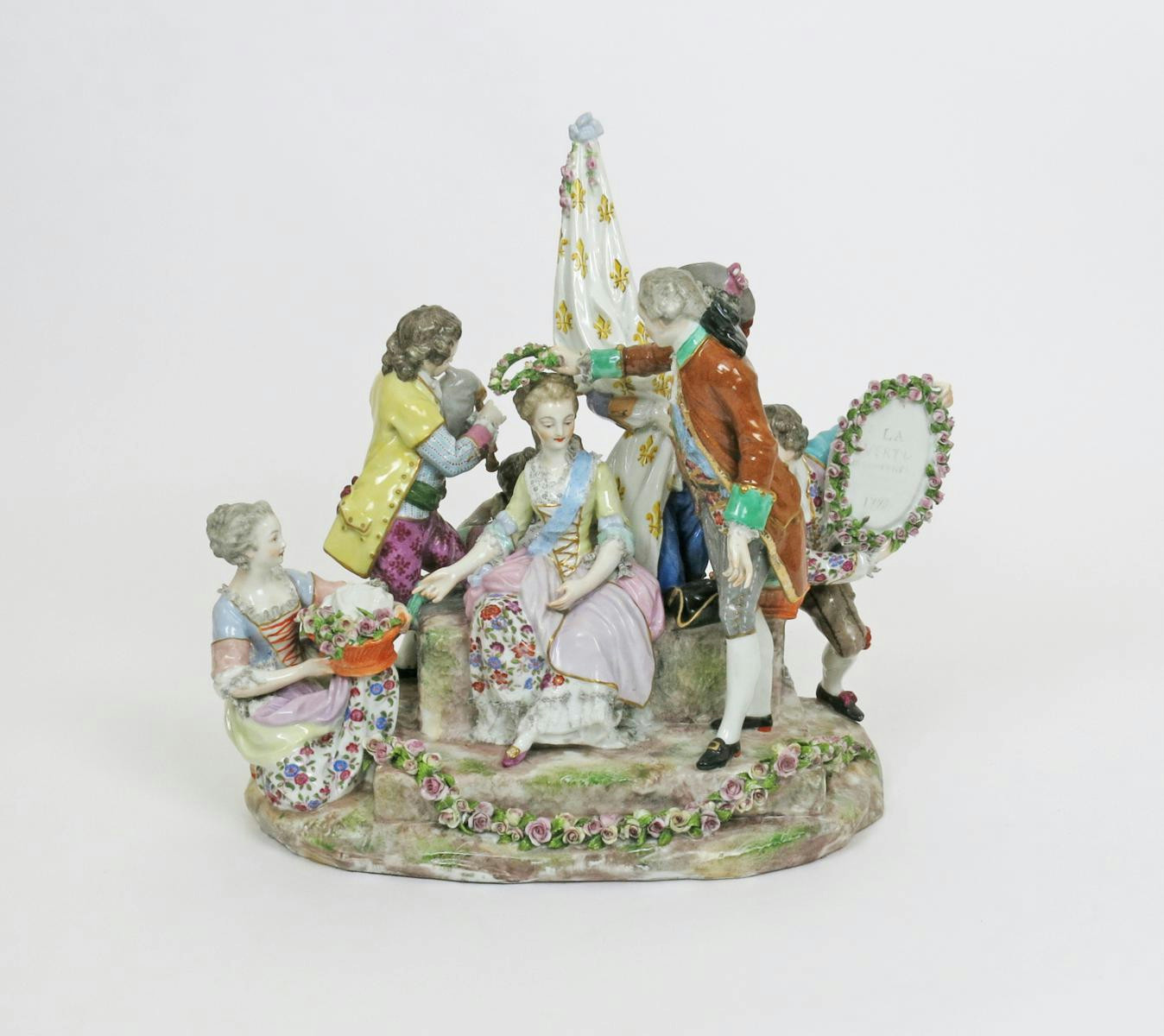 A large Samson porcelain figure group of Virtue 19th century, after Meissen, a young maiden being crowned with a wreath of pink roses while a figure behind holds the French Royalist flag, another holding a plaque engraved 'La Vertu 1775', a further figure plays the bagpipes while a lady sits beside with a basket of roses, pseudo crossed swords mark, 37cm high. Containing in a contemporary custom-made case bearing the shield for the French monarchy.