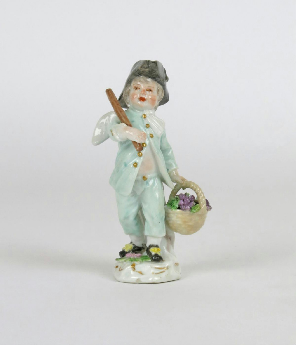 A Meissen figure of Cupid in Disguise as a grape seller mid 18th century, carrying a stick and a basket of grapes, wearing a pale blue suit open at the waist, blue crossed swords mark to the reverse, some good restoration, 8.7cm.