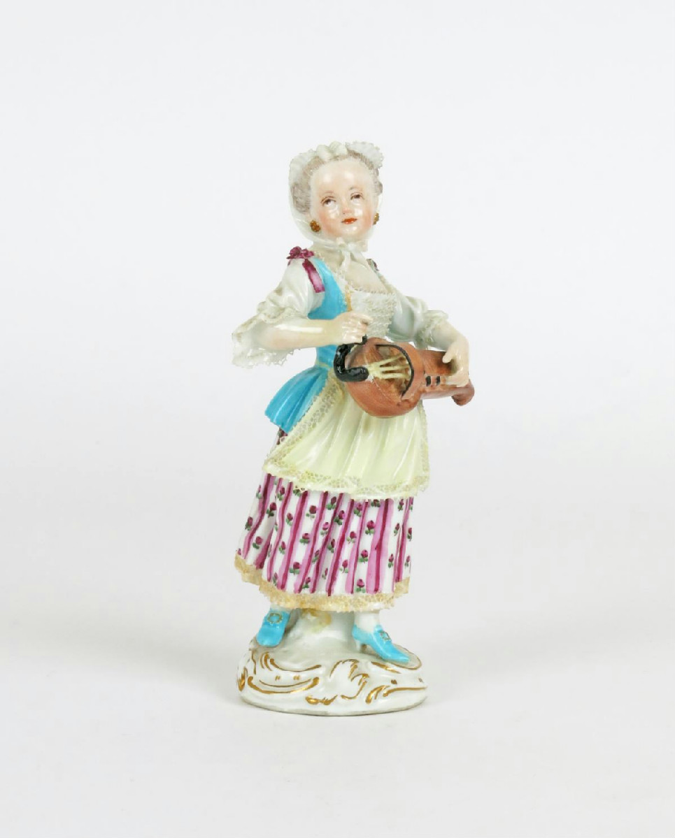 A Meissen figure of a hurdy-gurdy player c.1775, standing and playing her instrument, wearing a turquoise bodice with matching shoes, blue crossed swords and dot mark, incised B79 to the reverse, some restoration, 13.5cm.