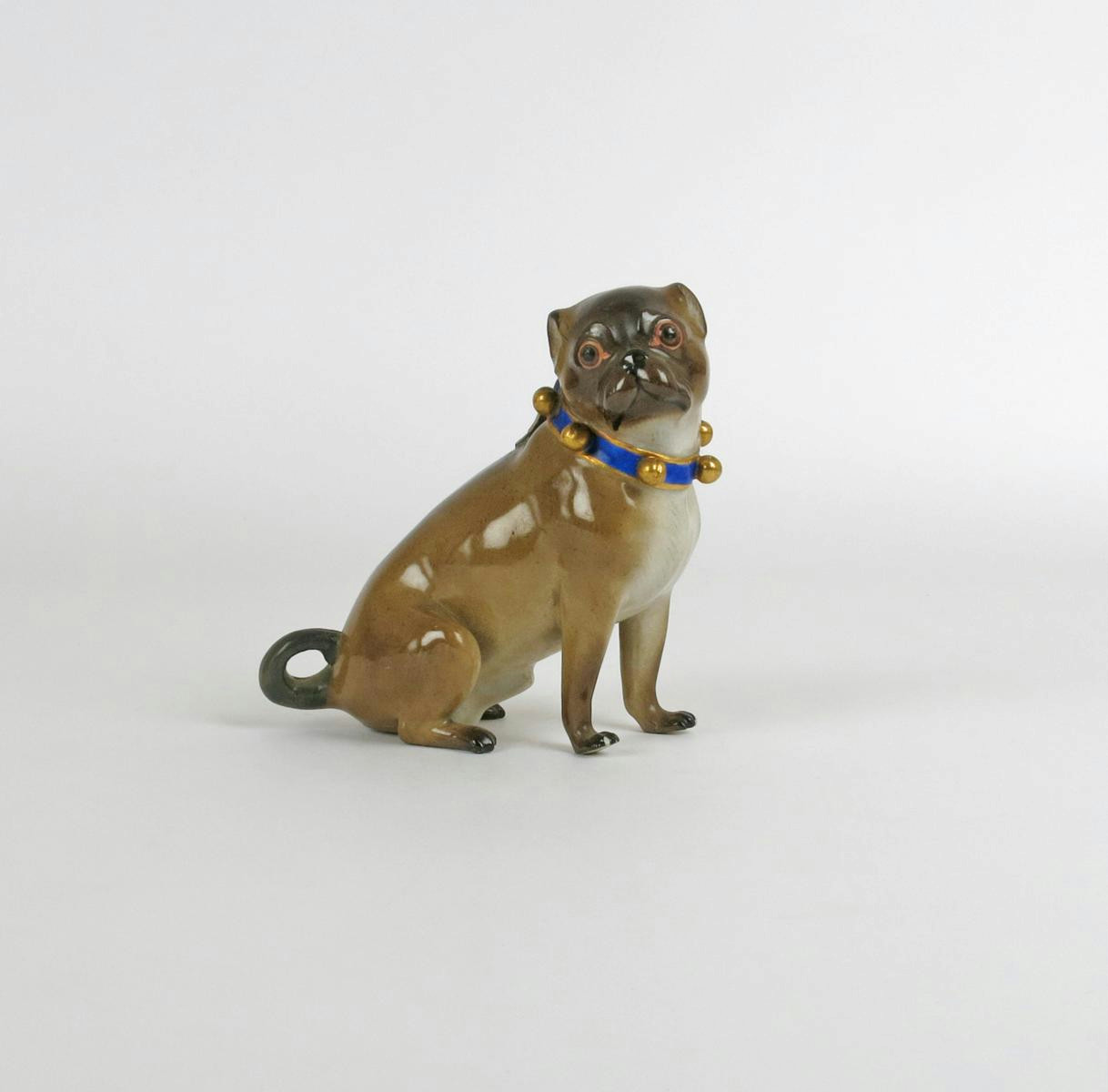 A Meissen model of a seated pug 19th century, with head turned to the right, wearing a blue collar with gilt bells, blue crossed swords mark, restoration to the tail, 12.5cm.