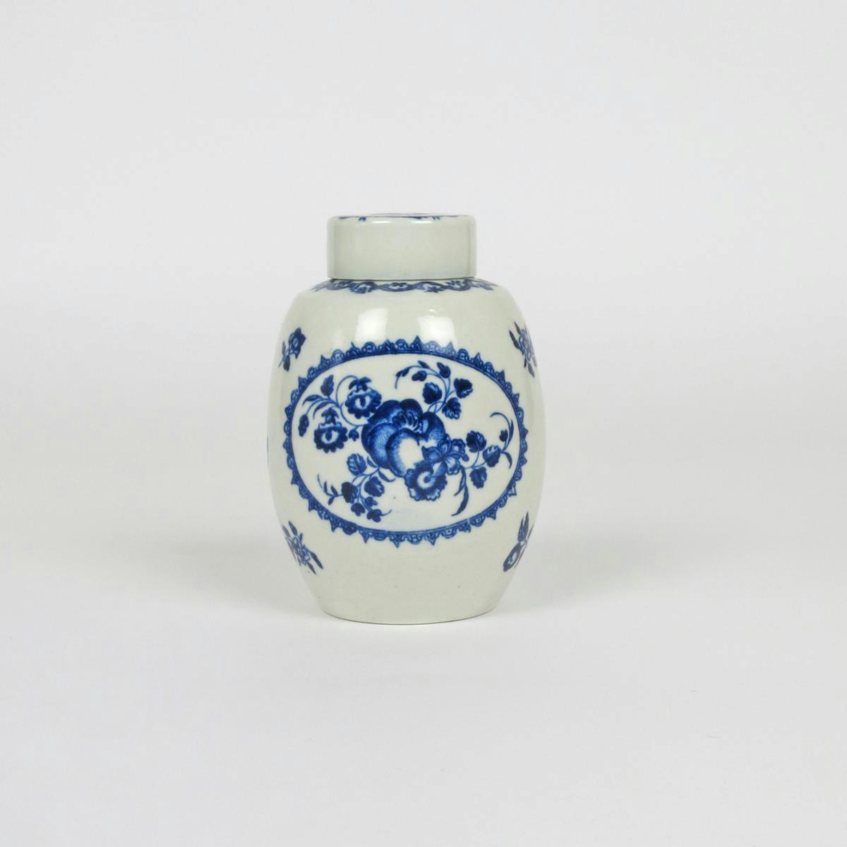 A Worcester blue and white tea canister and cover c.1775, the ovoid shape printed with the Fruit and Wreath pattern, the two panels between smaller floral sprigs, the flattened cover with further flowers and a scrolled border, 13cm. (2)