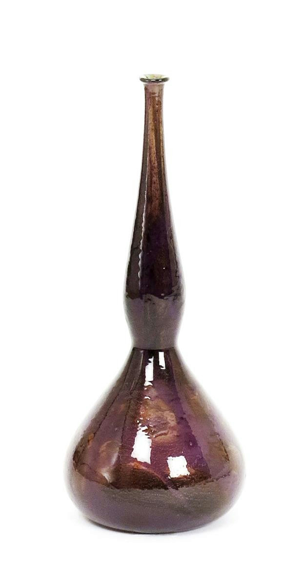 A James Powell & Sons Whitefriars glass solifleur vase, ovoid with knopped neck and and everted rim, purple glass with white striations and aventurine inclusions 24cm. high