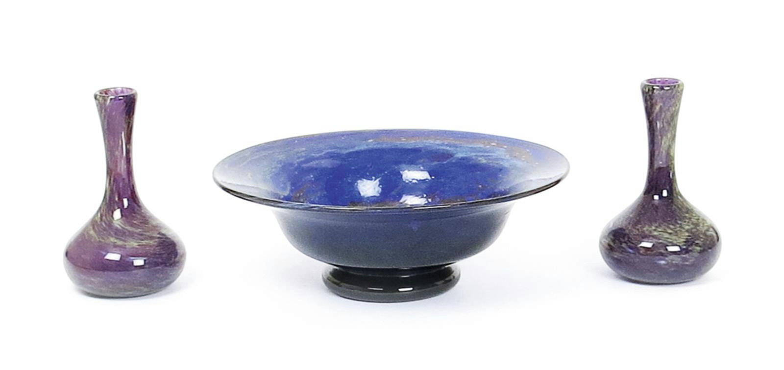 A Webb's Agate bowl and two vases, the bowl blue glass with red and blue mottled decoration, on applied foot, the vases purple glass with yellow streaks, cased in clear unsigned bowl 30cm. diam.