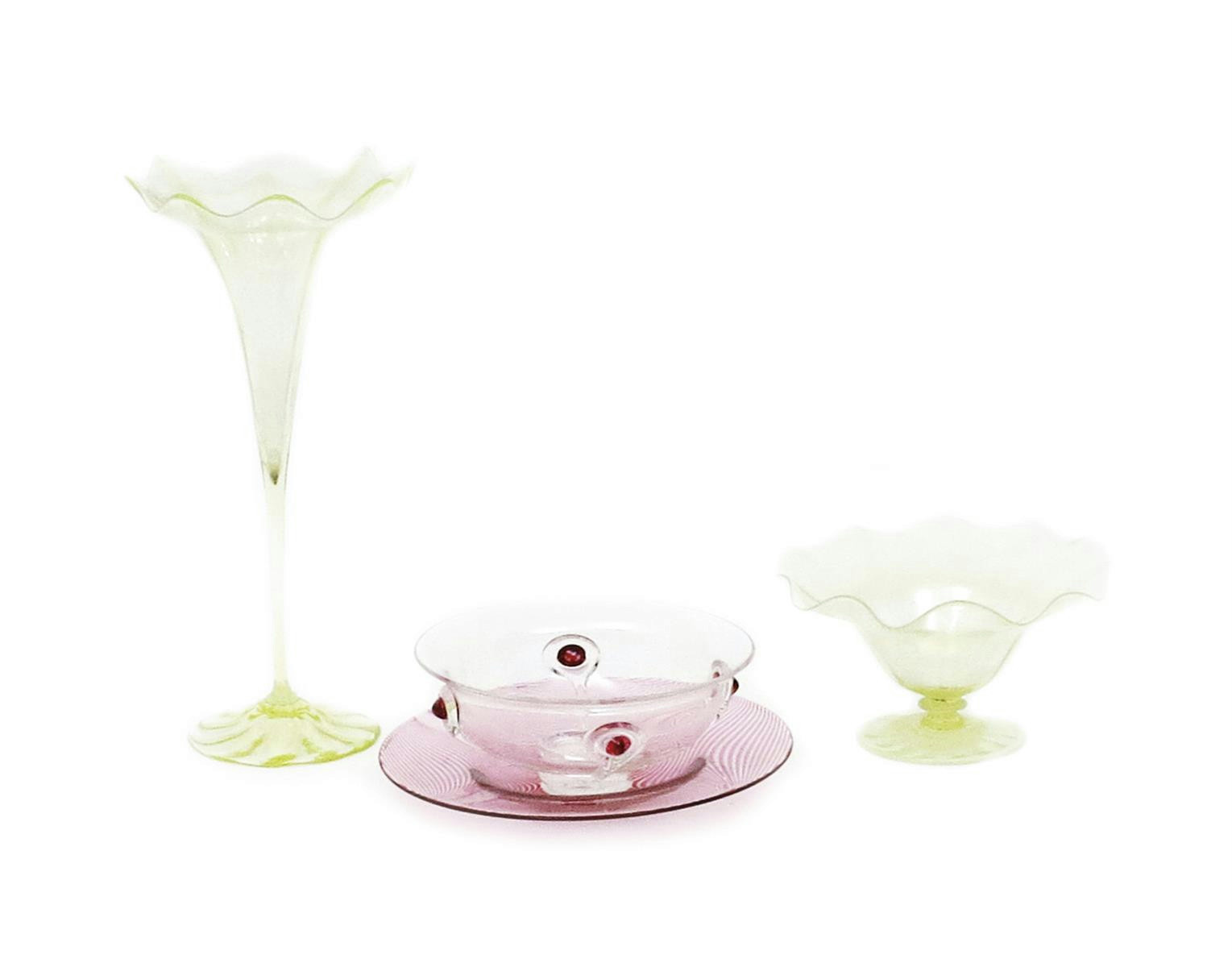 A tall Straw Opal footed vase, probably John Walsh Walsh, fluted form with flaring rim, a Straw Opal tazza a finger bowl and a plate unsigned 22.5cm. high