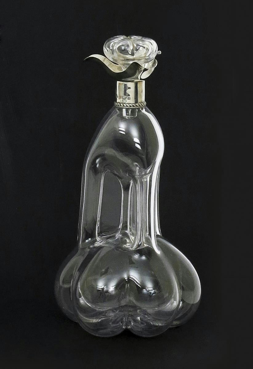 A Heath and Middleton silver mounted glass decanter, compressed gourd form with trilobed neck, with mushroom stopper stamped marks, Birmingham 1900 28cm. high